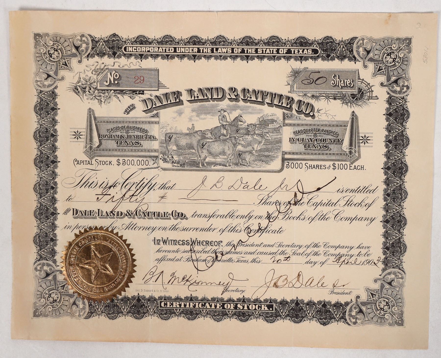Stock certificate No.29 issued by The Dale Land & Cattle Company to J.B. Dale Jr. for 50 shares at $100 per share. It's dated April 20, 1903 and signed by secretary B.N. McKinney and president, J.B. Dale Sr. It's hand cancelled, has a company gold seal and a vignette of a cattle drive.