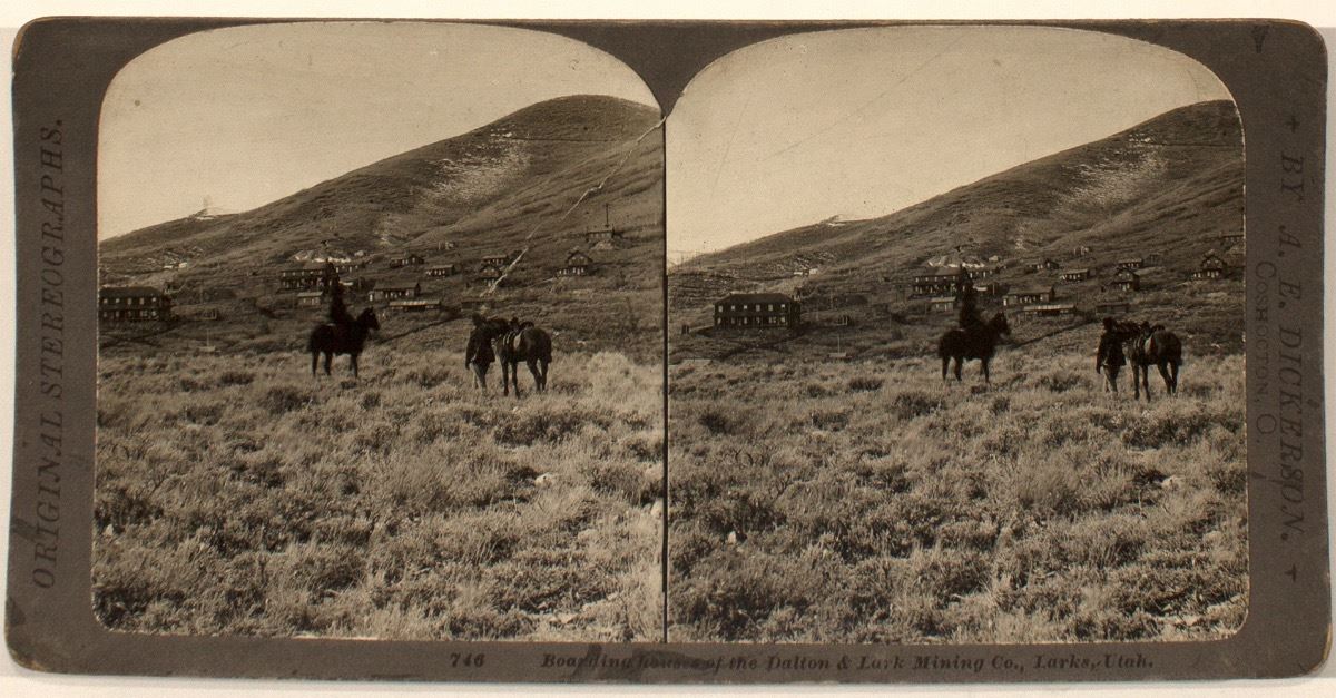 Rare view! No 746. Boarding Houses of the Dalton & Lark Mining Co., Larks, Utah. Published by A.E. Dickerson, Coshocton, Ohio. View of two men on horseback with houses and mine on hill in background. Crease/rip going through left panel. Dickerson was active from the late 1880s to about 1910. The Dalton & Lark Mining Co. was a consolidation of 16 claims completed in 1895. The company became part of Bingham Mines Co. in Bingham Canyon, Salt Lake County. Lands are circa 500 acres, including the Dalton & Lark and Commercial mines, on the west side of Bingham Canyon, and the Mascotte mine, these being the principal properties…. The Dalton & Lark mine, area 240 acres, has shafts of 850’ and 1150,’ with 4 tunnels…extraction being exclusively by tunnel. The Dalton & Lark vein on the 11th level averages about 6’ width, carrying about 2% copper, 6 oz. silver and $1.50 gold per ton…The lead ores of the Dalton & Lark are richer than the copper ores, as a rule. The mine is claimed to have about 250,000 tons of medium grade and 500,000 tons of low grade ore in sight. The Mascotte mine, area 160 acres, has the Mascotte tunnel of circa 7,000’ length, which drains the Dalton & Lark…providing extraction only. The D & L was dissolved by order of court in 1911. [Ref: Copper Hndbk, 1908, pp.372-3; 1918, p. 78]. (Prag Collection) City: Larks State: Utah Date: c. late 1890s hwac# 27139