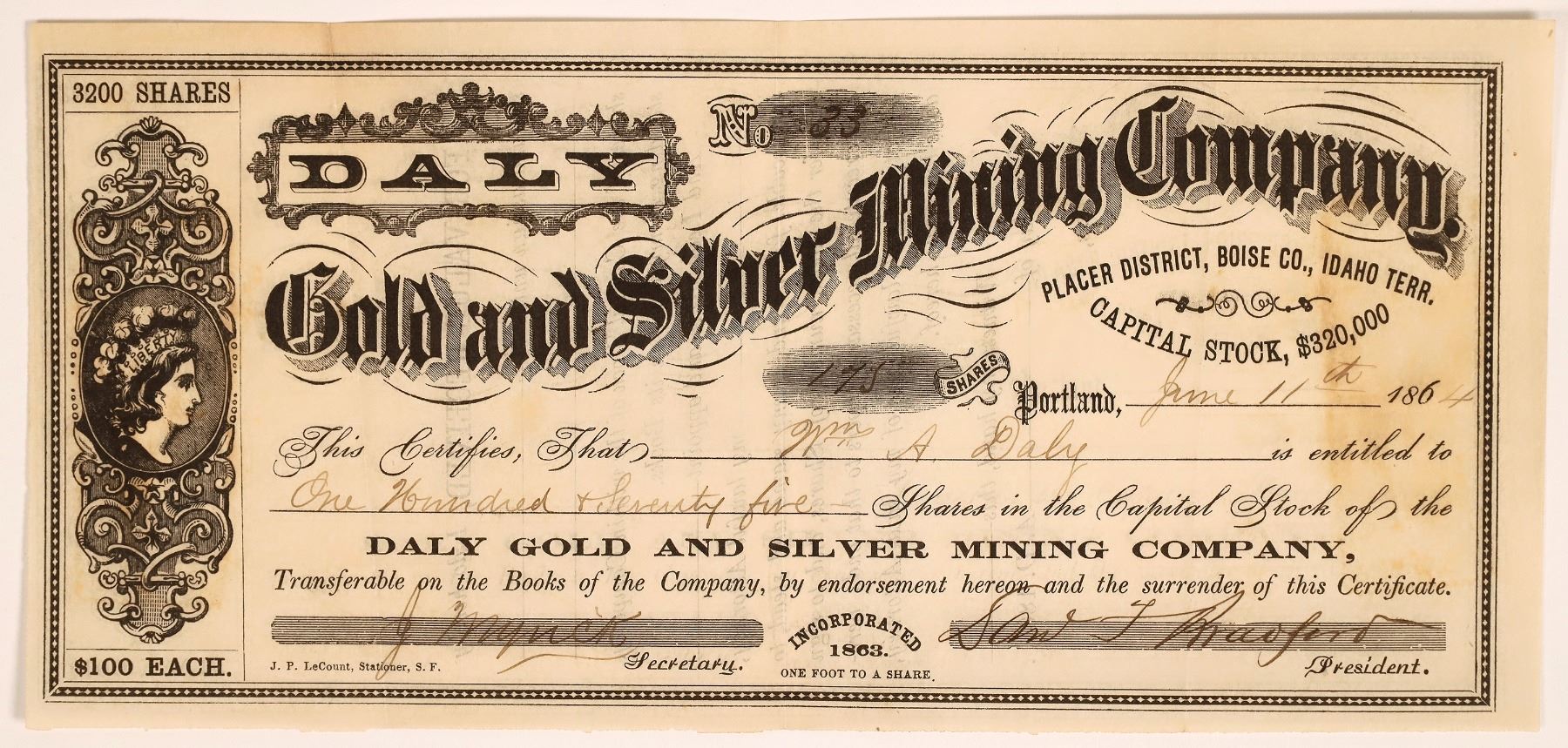 Placer District, Boise Co., Idaho Terr. (printed at right under title). Inc. 1863. No. 33, issued for 175 shares to William Daly (namesake of the company!) on June 11th, 1864 in Portland. Signed by president Daniel Bradford and secretary J. Myrick. Not cancelled. Black border and print, portrait vignette of Lady Liberty. Printed by JP LeCount, SF. Folds, toning on right side. 4.25 x 9" This company was named after William A. Daly, one of the second group of prospectors to the area who founded Centreville. Daly and partner Robbins erected the second stamp mill in the area in the spring of 1863. (Ref: Bancroft, 1890, History of Washington, Idaho, and Montana, pg. 407, 410).