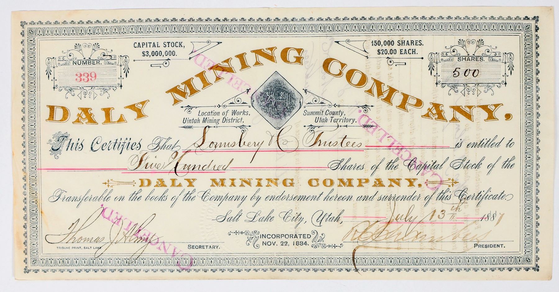 Inc. 1884. Location: Uintah Mining District, Summit County, Utah Territory (printed at top). No. 339, issued for 500 shares to Lounsbery & Co. in 1887. Signed by president Chambers and secretary Almy. Stamp cancelled. Brown border, black and gold print, mining vignette. Folds. RP Lounsbery was vice president of the famous Homestake Mining Company and business partners with JB Haggin and George Hearst in other mining properties. He also played a crucial role in selling gold in New York. Hearst was no stranger to Utah. While he first made his money on the Comstock in Nevada, it was the Ontario Mine in 1872 in Park City, Utah that solidified his fortune before he took on the Homestake in South Dakota.