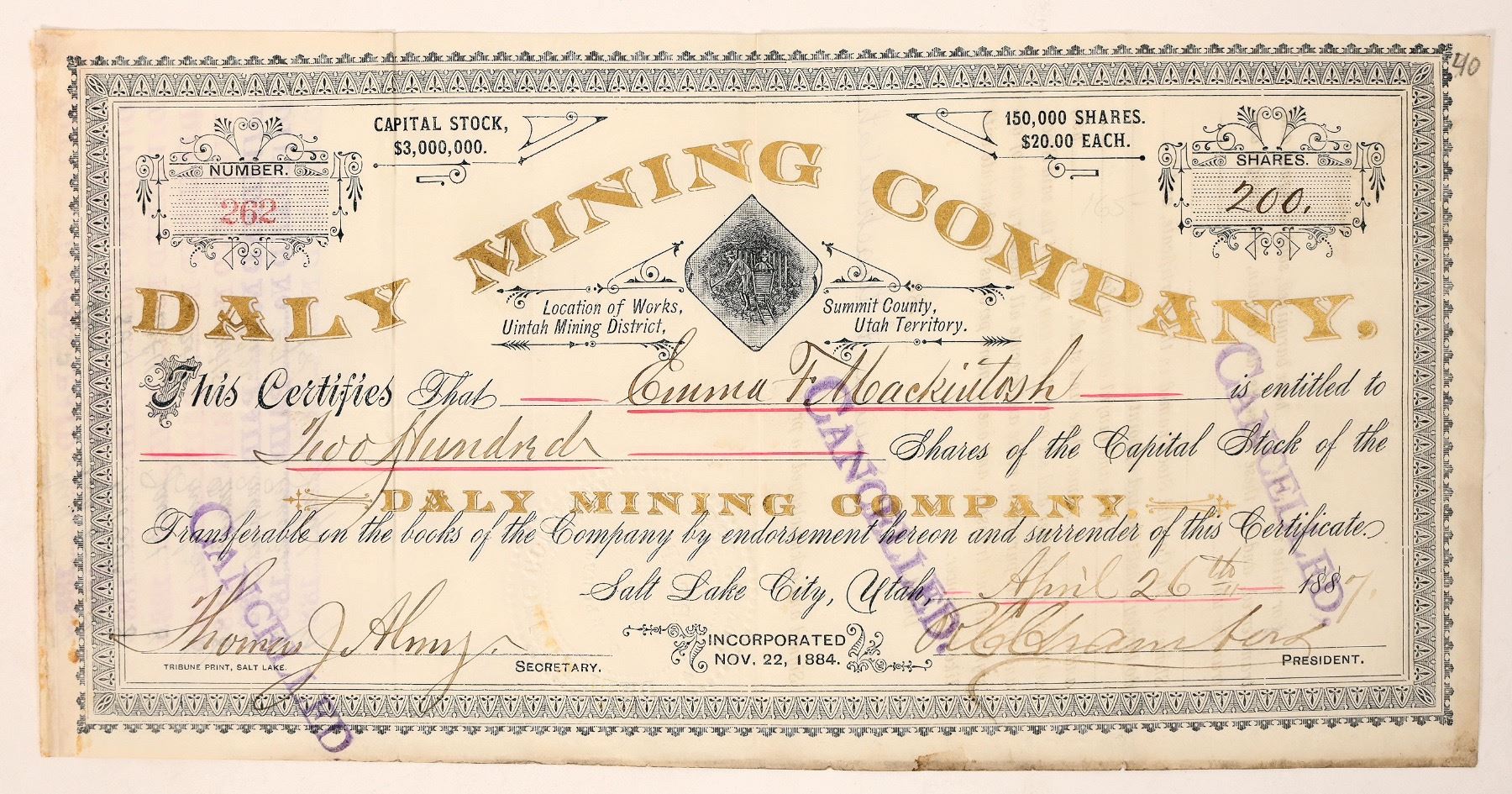 Issued 1887 Daly Mining stock. Located in Uintah mining district, Summit county.[ Summit County Utah