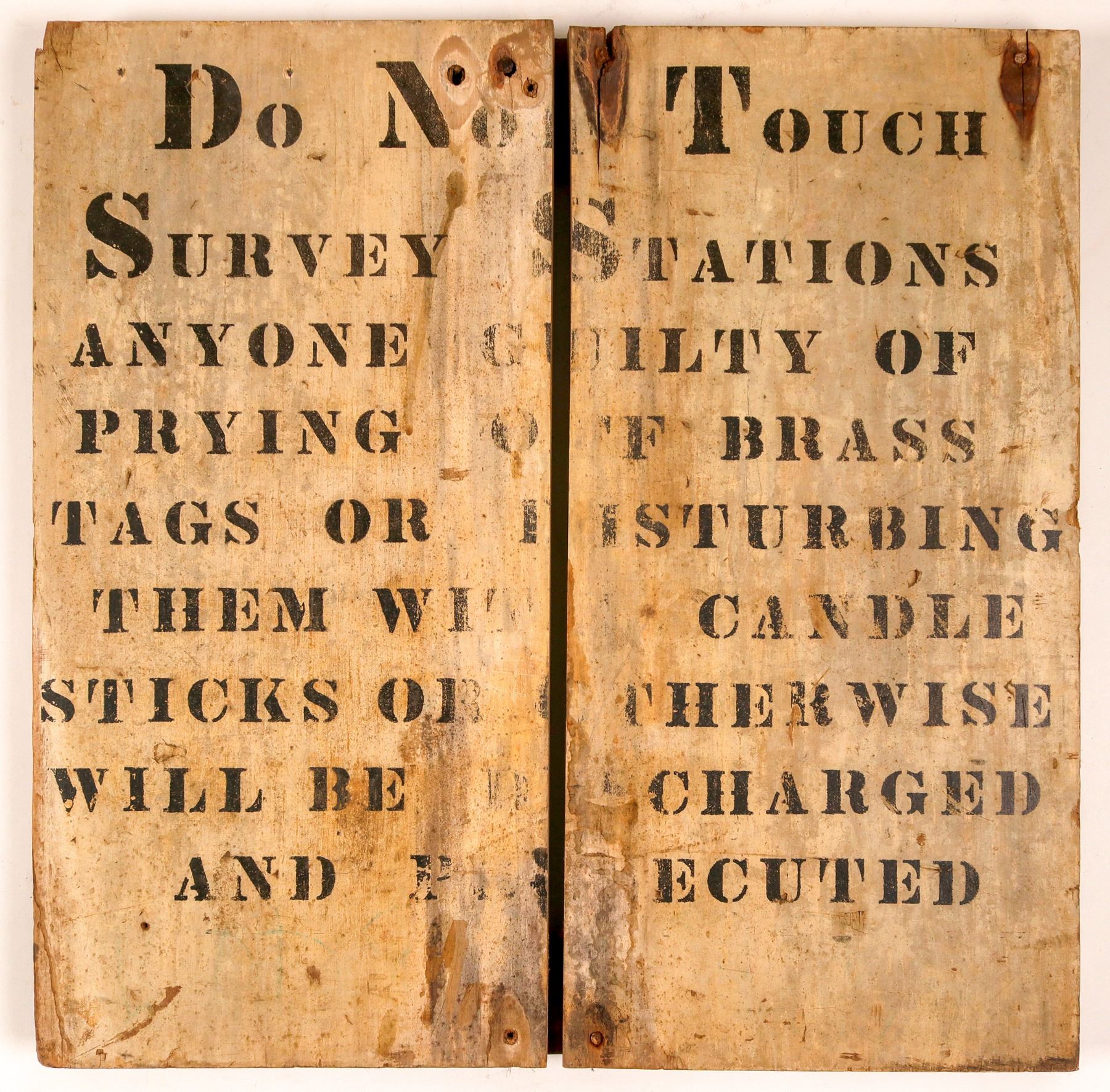 Wooden sign with black stenciled lettering, approx 24x24.5-inches, which reads, "Do Not Touch Survey Stations // Anyone guilty of prying off brass tags or disturbing them with candle sticks or otherwise will be discharged and prosecuted //" Some of the letters along the center seam are rubbed off, the clear intent of the warning is easily seen.Geff Pollock Collection