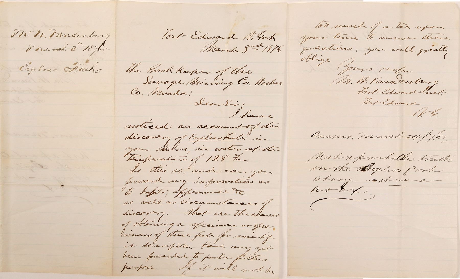 A tall tale published in the Territorial Enterprise on Februrary 19, 1876 caused an east coast scientist to inquire about obtaining a specimen. Here is the handwritten letter of March 3, 1876 from N. W. Vandernberg of the Fort Edward Institute of New York to the Bookkepper of the Savage Mining Co., Washoe County, Nevada. Also included is the full text of DeQuille's story and background on the Fort Edward Institute.