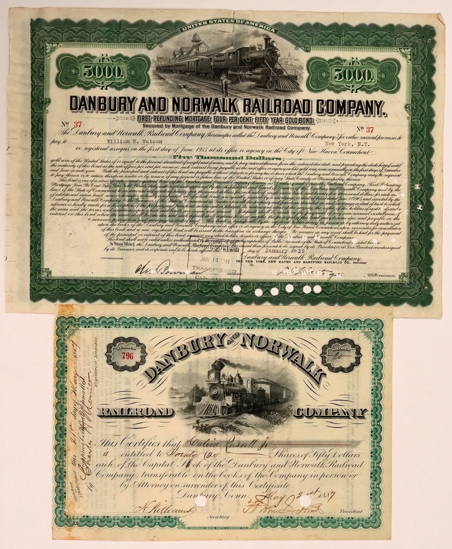 Stock and bond certificate from this railroad. Stock is issued in 1887 at Danbury, Conns. Very nice, large steam engine vignette. Hole cxls. thru signatures. 1939 Bond is a First Refunding $5000 Mortgage, 4%, Fifty year gold bond. Large steam engine left to right. Stamped "surrendered" in 1941. Part of stub attached at the left. Scotch tape repair to fold split on the back. American Bank Note, printer on both. Connecticut Danbury Ken Prag Collection