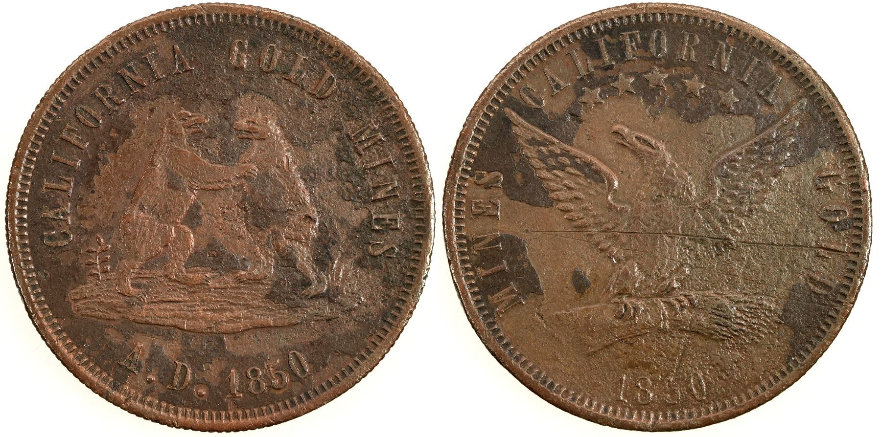 Obv.: California Gold Mines/ (dancing bears) / A. D. 1850; Rev.: California / Gold / Mines / 1850 / spread eagle. Br., rd., 35 mm.