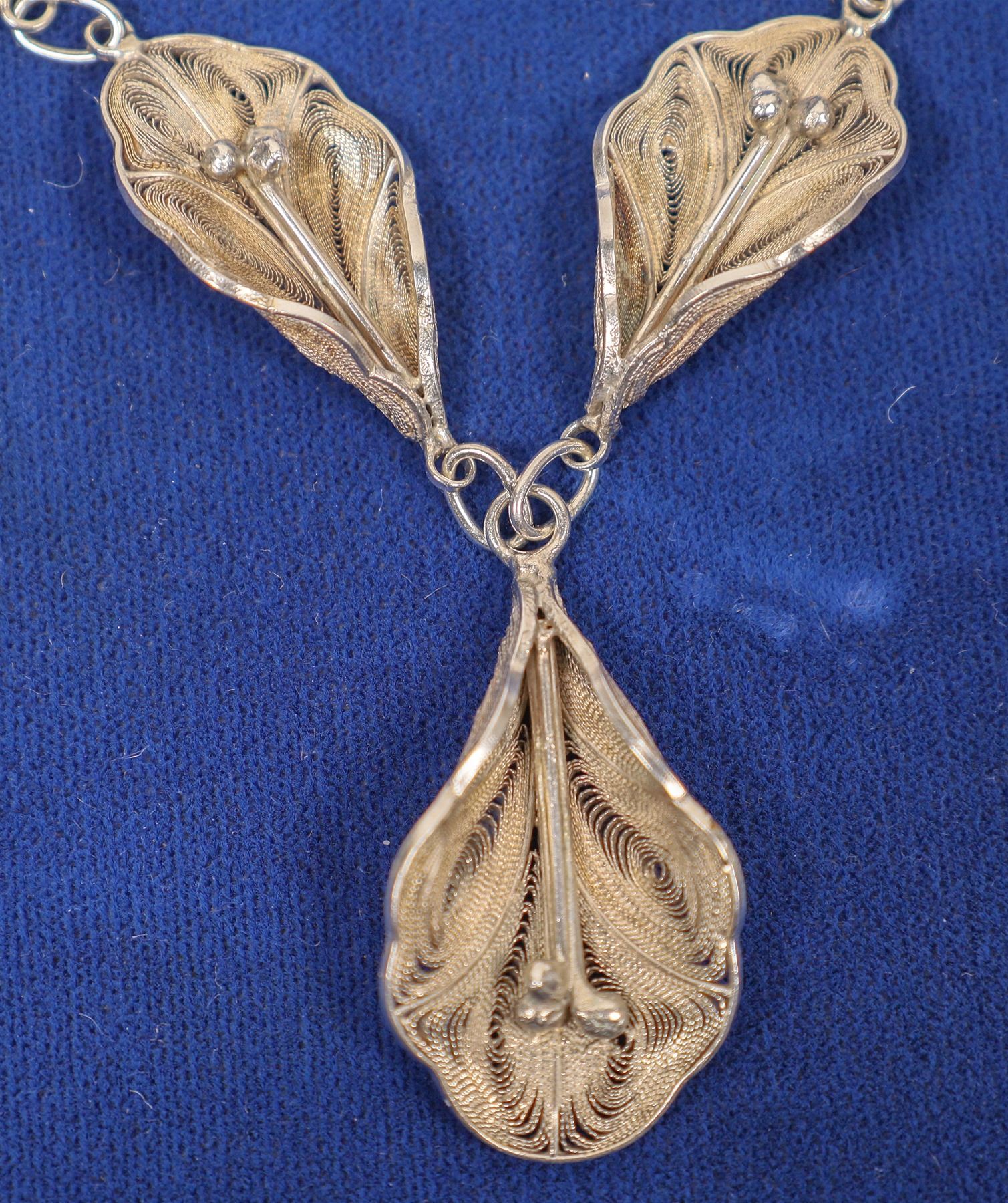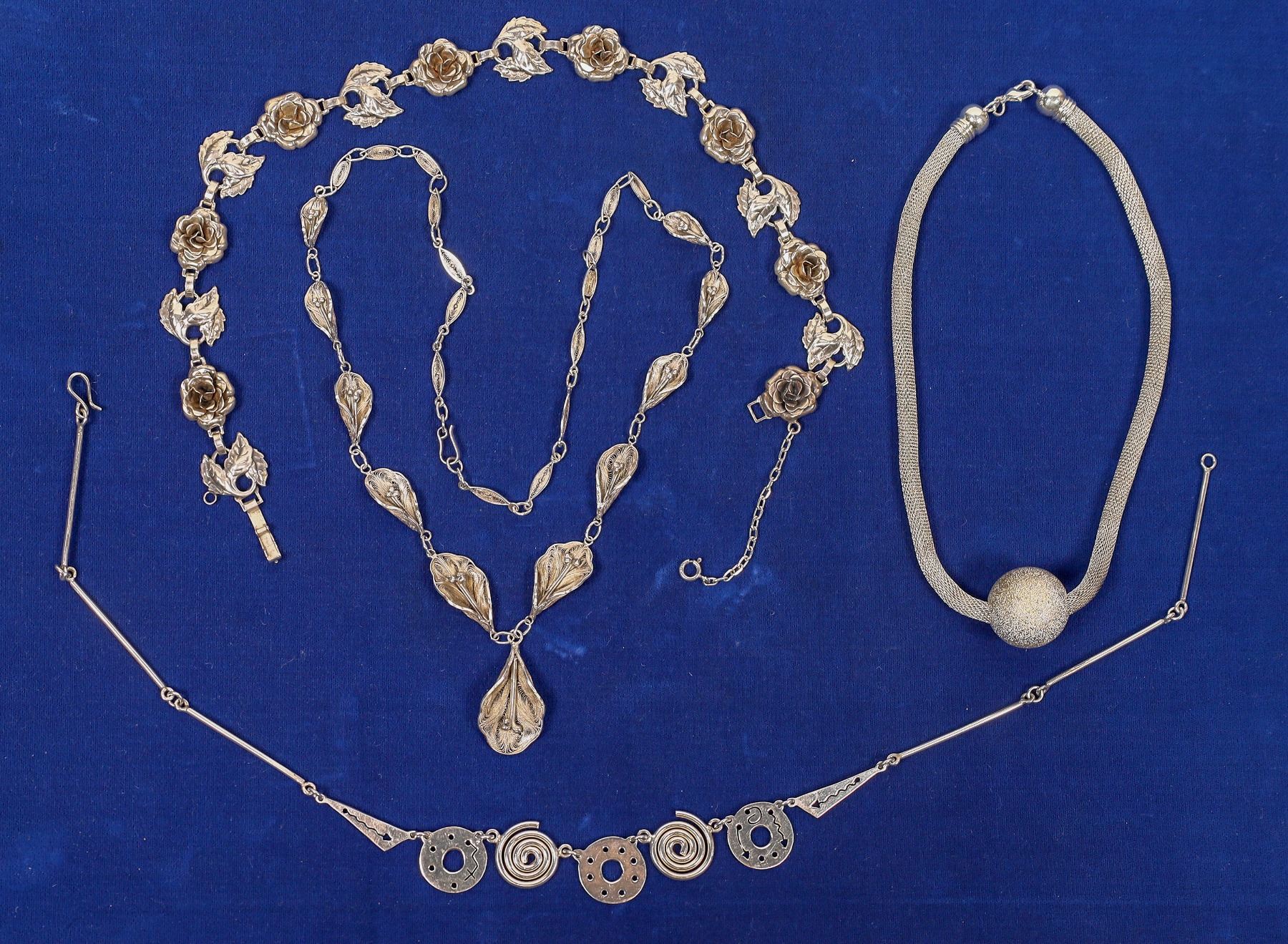 Lot of four pieces of Danecraft sterling silver jewelry. 1) 18 inch rose petal and leaf necklace; 2) 16-inch necklace of silver coil with sliding silver ball. 3) 19-inch necklace with five round designs. 4) 24 inch silver necklace of leaves with petals.