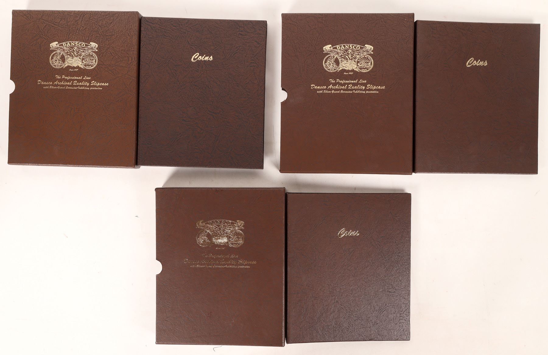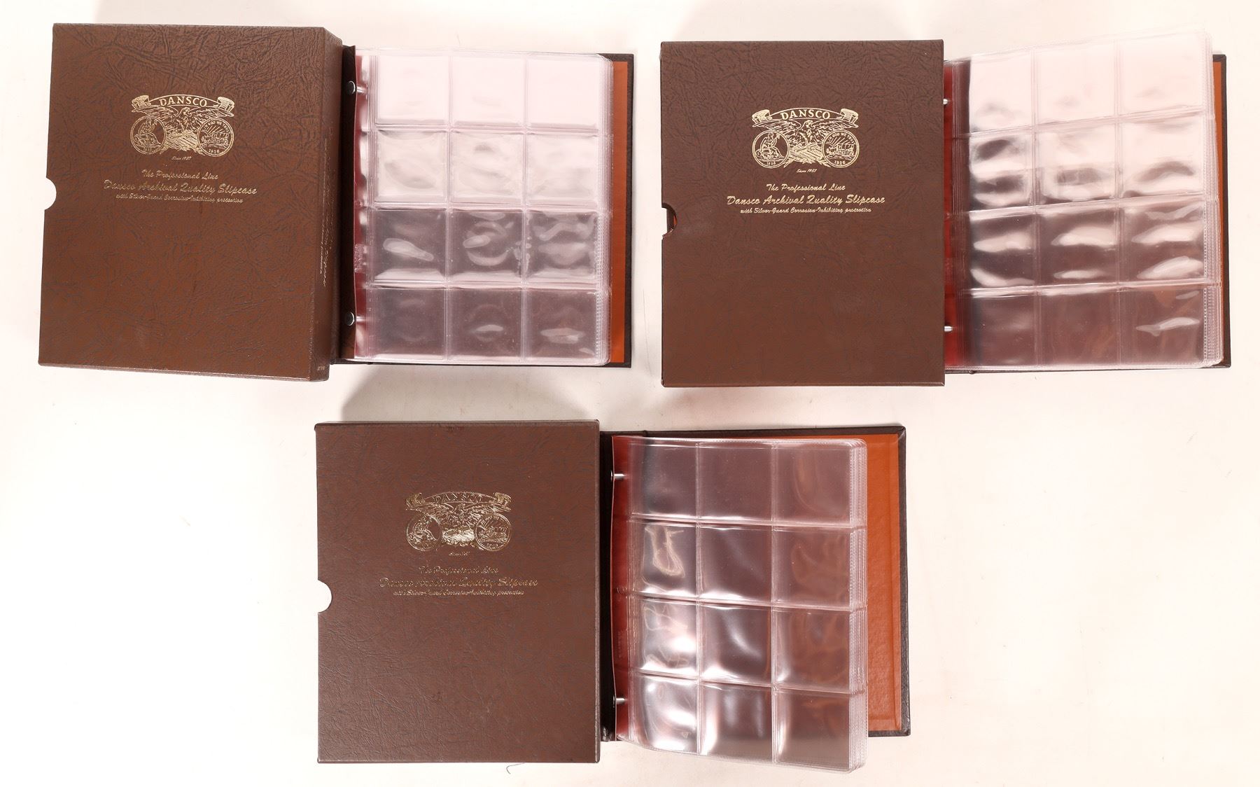 Three brand new Dansco #7000 albums: "Coins", with slip covers and nine empty plastic pages to fill with your coin collection. Each album contains 9 vinyl pages. On each page there are 12 pockets for 2x2 coin holders. The albums retail for $30.45 each and the slip covers for $21.74 each. The Dansco Album Store describes the slip cover: "The Dansco Archival Quality Slipcases are produced with Silver-Guard Corrosion-Inhibiting protection. No other product on the market matches Silver-Guard Corrosion-Inhabiting protection. This Military Specification material permanently neutralizes corrosive gases in the air that can cause toning and discoloration. This works with silver, gold copper, and nickel coins and metals, medallions, bars, and ferrous metals. Dansco Coin Albums have always been made with the best archival materials and with the addition of the finely crafted slipcase the protection is invaluable."