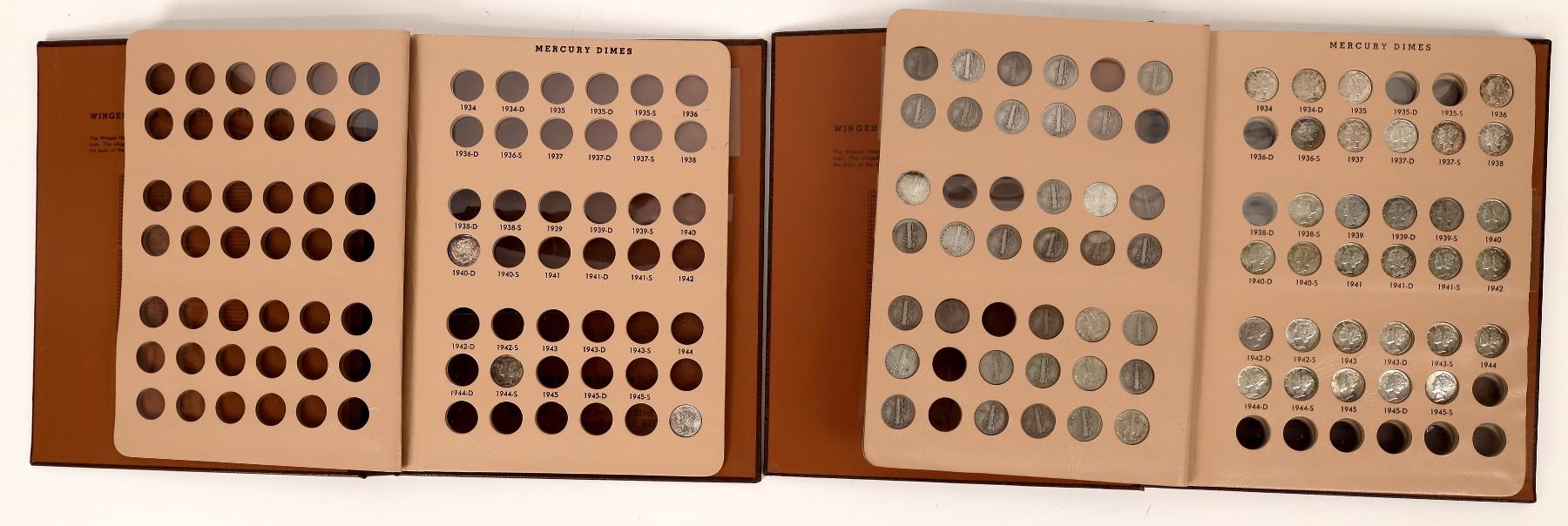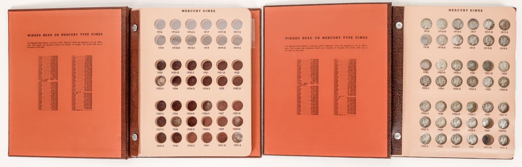 Lot of two Dansco coin albums No. 7123 Mercury Dimes: 1) three dimes included, one BU; 2) with 66 dimes in G-AU condition.