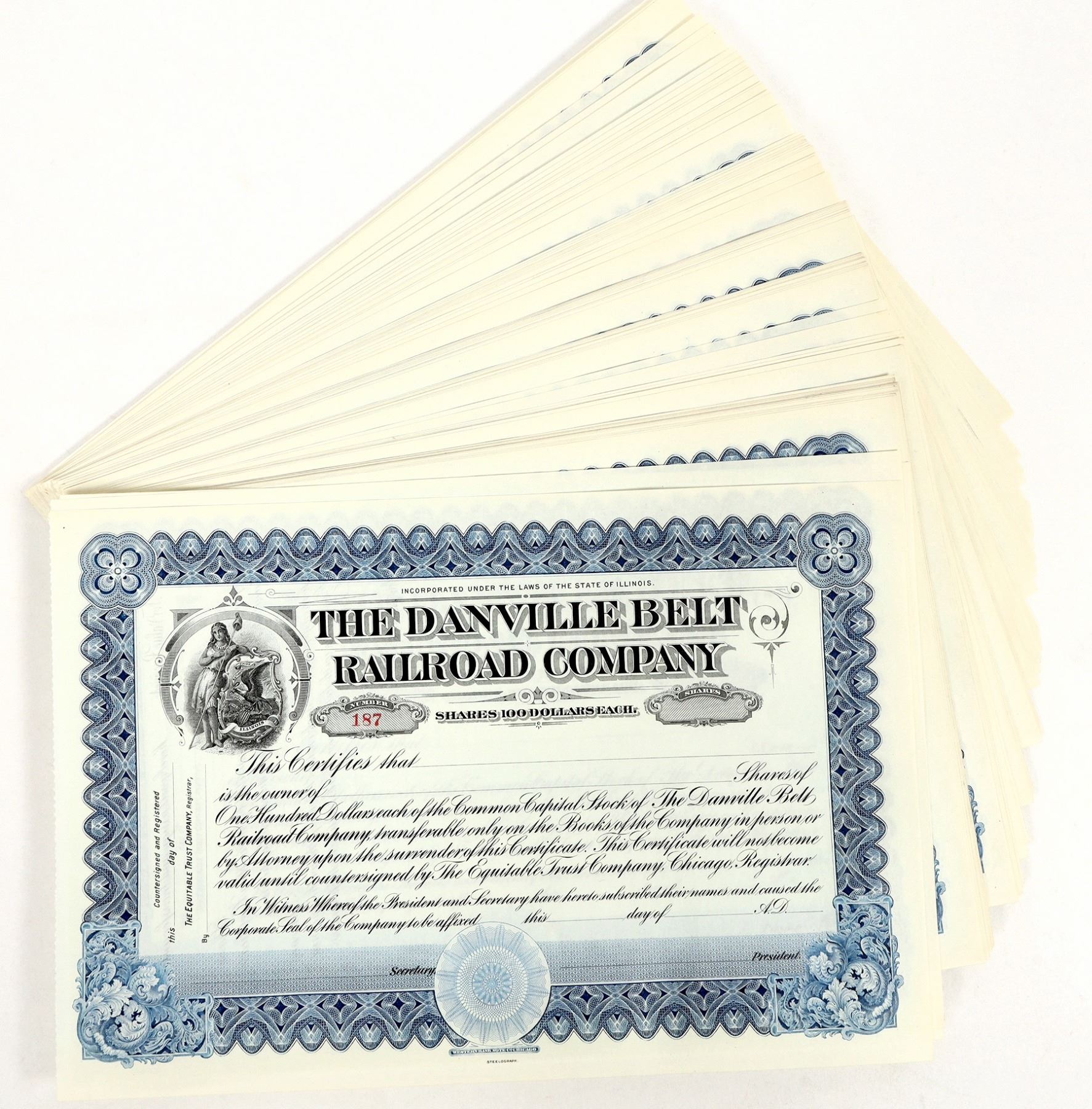 Group of approx. 80 stock certificates from the Danville Belt Railroad Company, all unissued. Likely date c. 1910s. Blue print, nice vignette of Native American woman w/ Illinois state seal. 1.75"x8" certs, all in excellent condition; see photos.