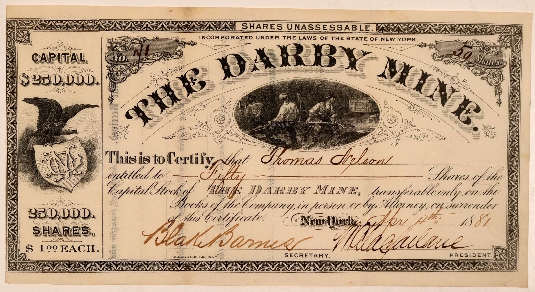 Rare. According to 1889 articles in the Silver Cliff Rustler, the Darby Mine was located in the Hardscrabble Mining District of Custer County, Colorado. Inc. in New York. No. 71, issued for 50 shares to Thomas Nelson in 1881. Signed by the president and secretary Barnes. Not cancelled. Black border and print, vignettes of miners with shovels and an eagle on a shield. Folds, light stains. Nice. 5 x 9.25" Not listed in C&L. An 1891 article says parties out of Canon City are operating the mine whose silver-copper ore is running as high as 600 ounces per ton. State:Colorado City:Custer County Date:1881 Provenance: