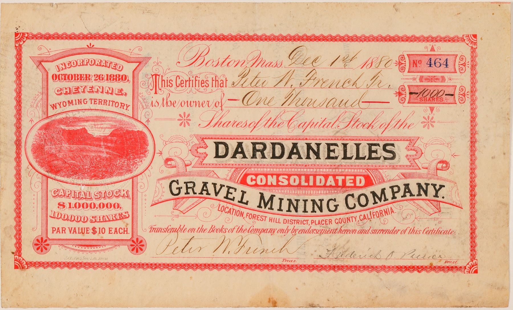 Location: Forest Hill District, Placer County, California (printed under title). Inc. Oct. 1880 in Wyoming Territory. No. 464, issued for 1,000 shares to treasurer Peter W. French on Dec. 1st, 1880 in Boston. Signed by French and also president Frederick O. Pierce. Not cancelled. Red and black print, red border and hydraulic mining vignette. 5.25 x 9" Pinholes, deep fold, stains and soiling. Articles in the E&MJ Vol. 31 (1881) indicate positive results from the superintendent. Ken Prag Collection