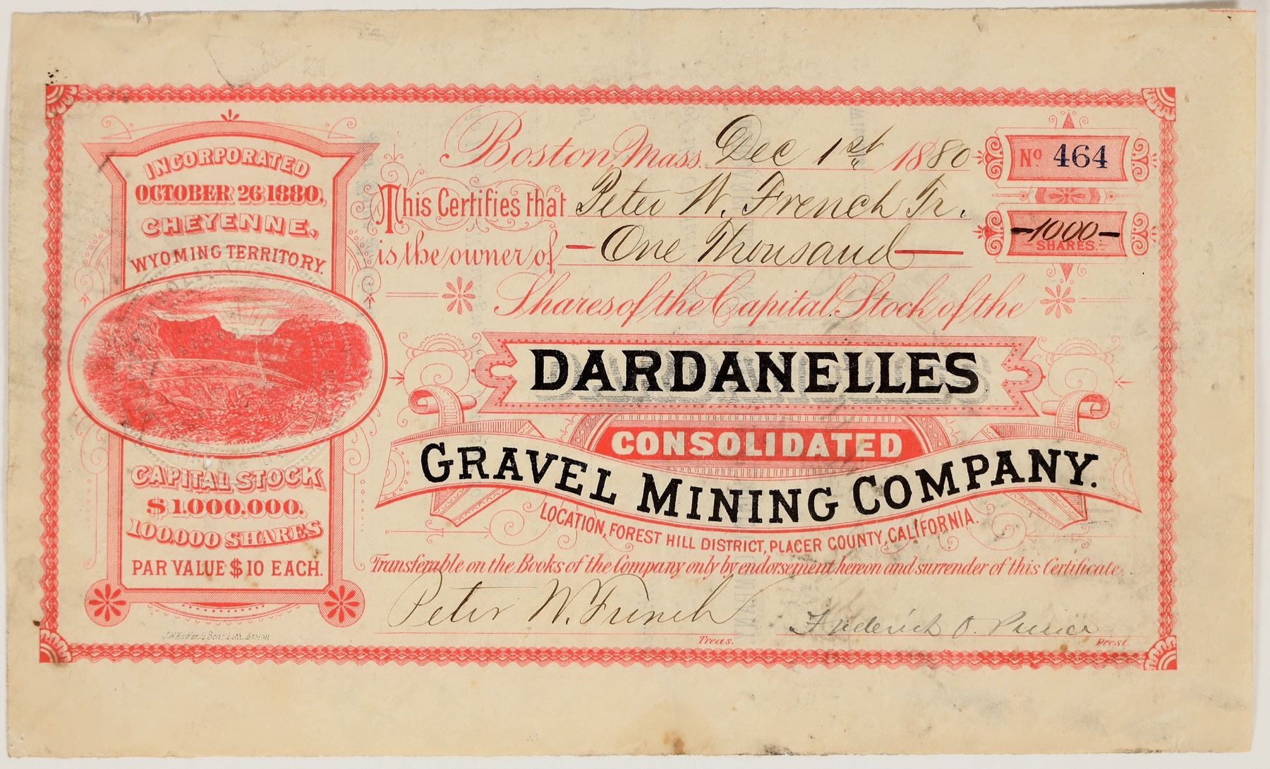 Location: Forest Hill District, Placer County, California (printed under title). Inc. Oct. 1880 in Wyoming Territory. No. 464, issued for 1,000 shares to treasurer Peter W. French on Dec. 1st, 1880 in Boston. Signed by French and also president Frederick O. Pierce. Not cancelled. Red and black print, red border and hydraulic mining vignette. 5.25 x 9" Pinholes, deep fold, stains and soiling. Articles in the E&MJ Vol. 31 (1881) indicate positive results from the superintendent. French was an Oregon cattle baron.