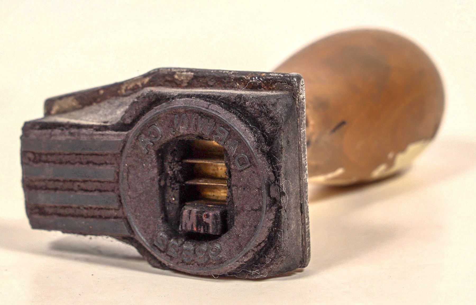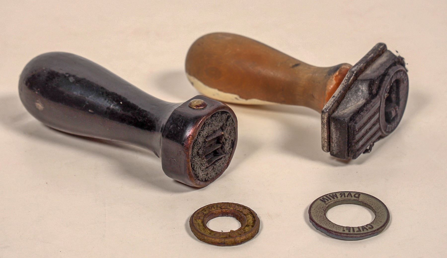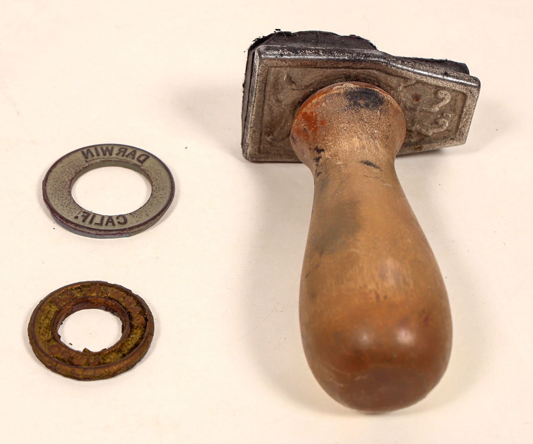 2 post 1900 Darwin, CA postal hand cancel devices with 3 O-ring style cancels.