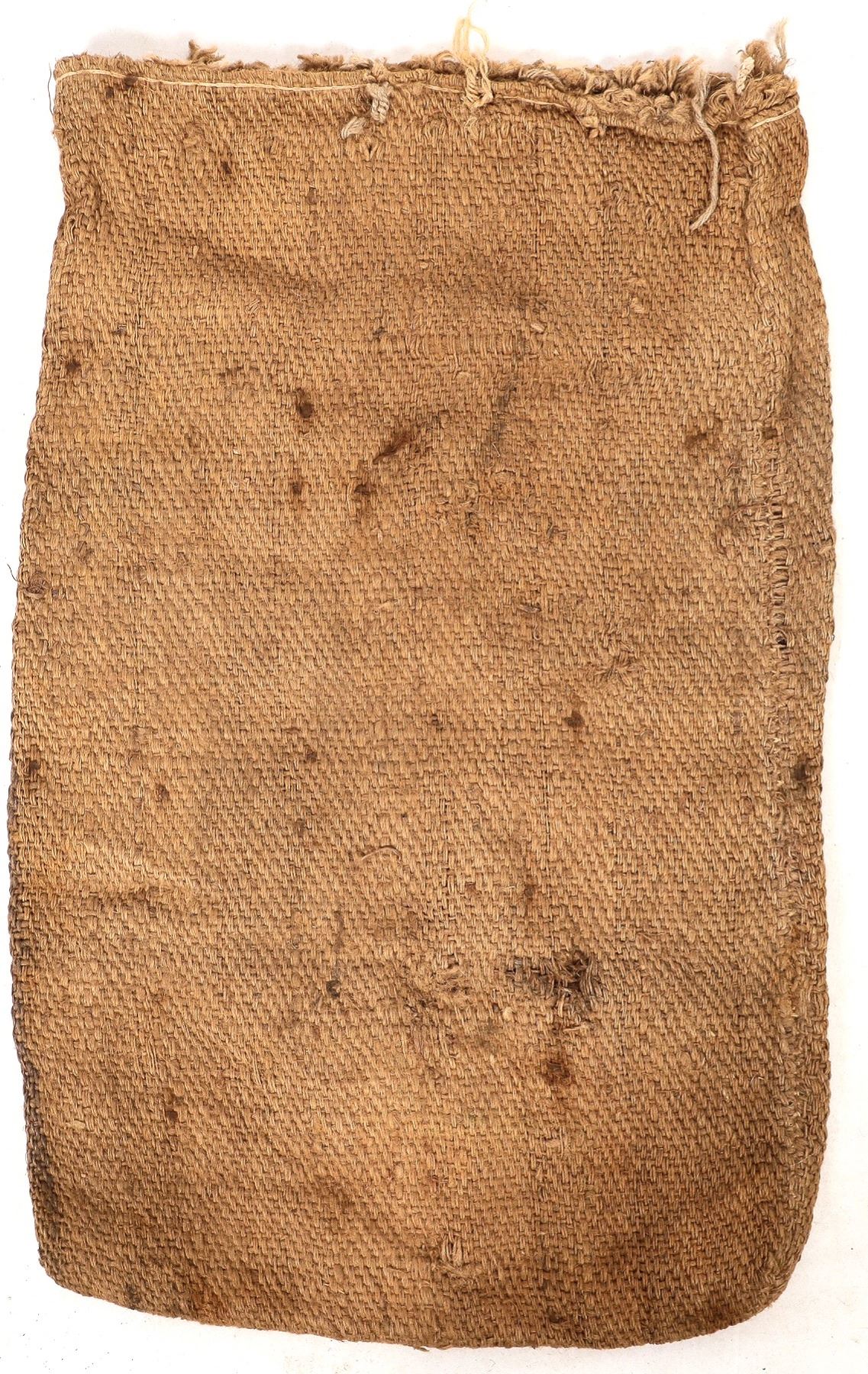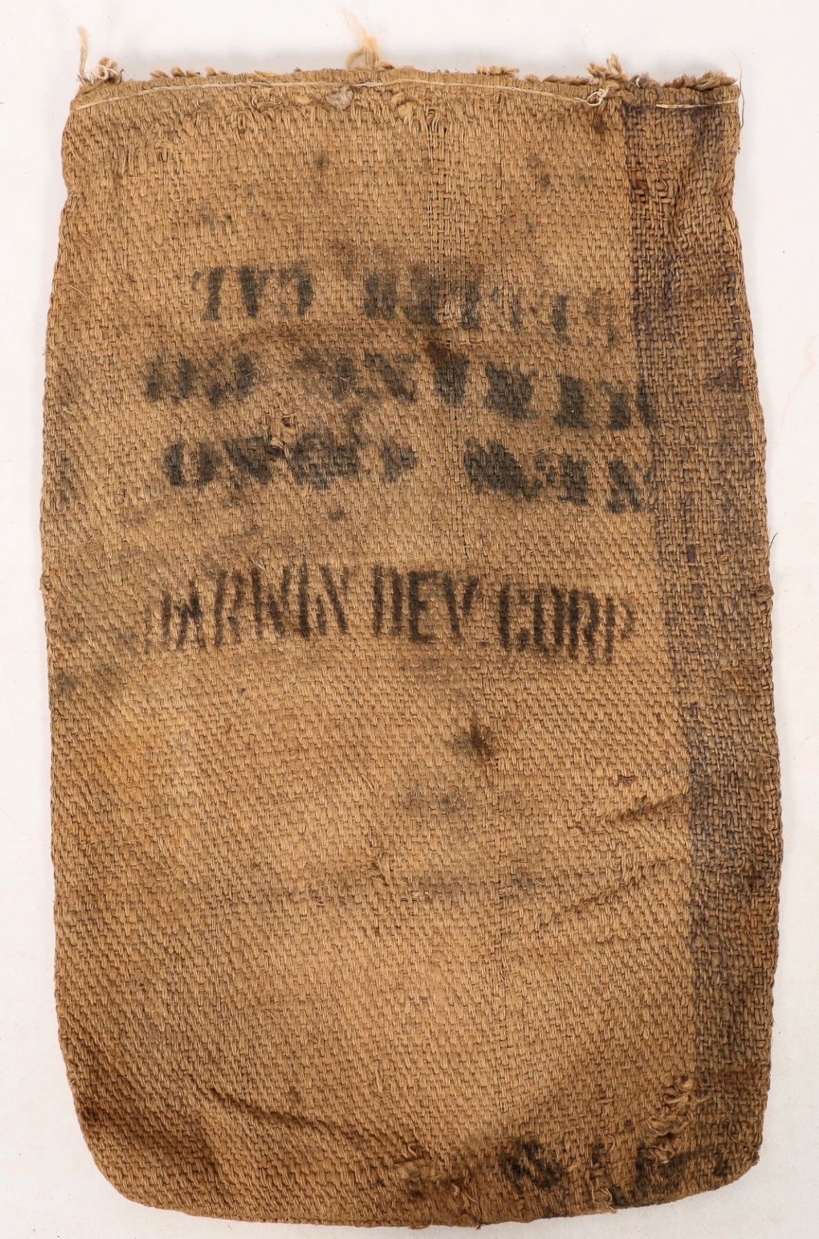 An historic burlap ore bag with bold black 1.5" tall printing on front: "Darwin Dev. Corp," with "New Coso/Mining Co/Darwin, Cal." printed in black 1" tall letters (upside down) above it, and a 2.25" wide black line down the side, c1870s. It is apparently a reused bag originally from the New Coso Mining Co., a company which formed in the 1870s. The approximately 14.5" x 22" coarse burlap bag would have held silver or lead ore from Darwin Development Corporation, which formed after the Darwin Development Company consolidated the Lucky Jim, Promontory, Lane, and Columbia mines and began the construction of a mill on the Lane property in 1915. It is not known what the black stripe signifies, but some mining engineers used color coding to indicate the grade of the ore. A few frayed areas front and back, otherwise in very good condition for its age. See photo(s) for more details.