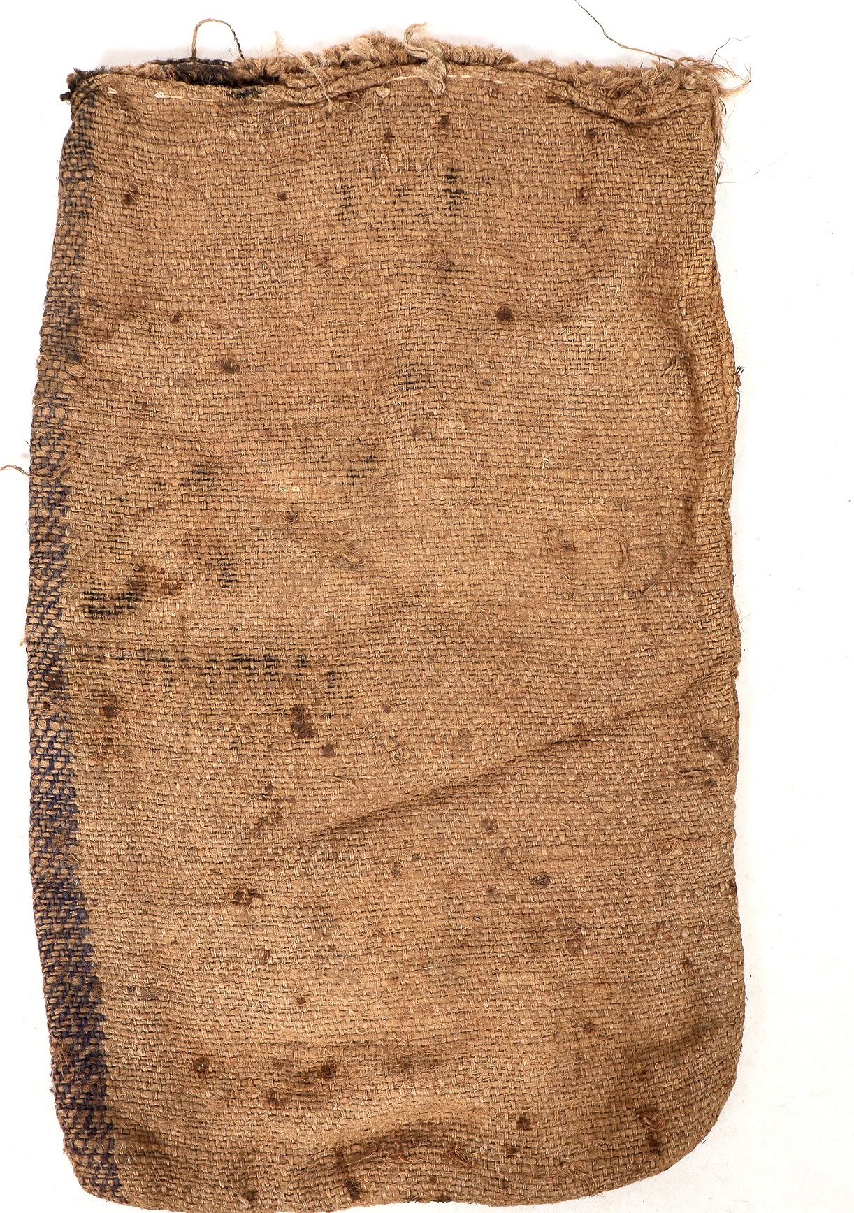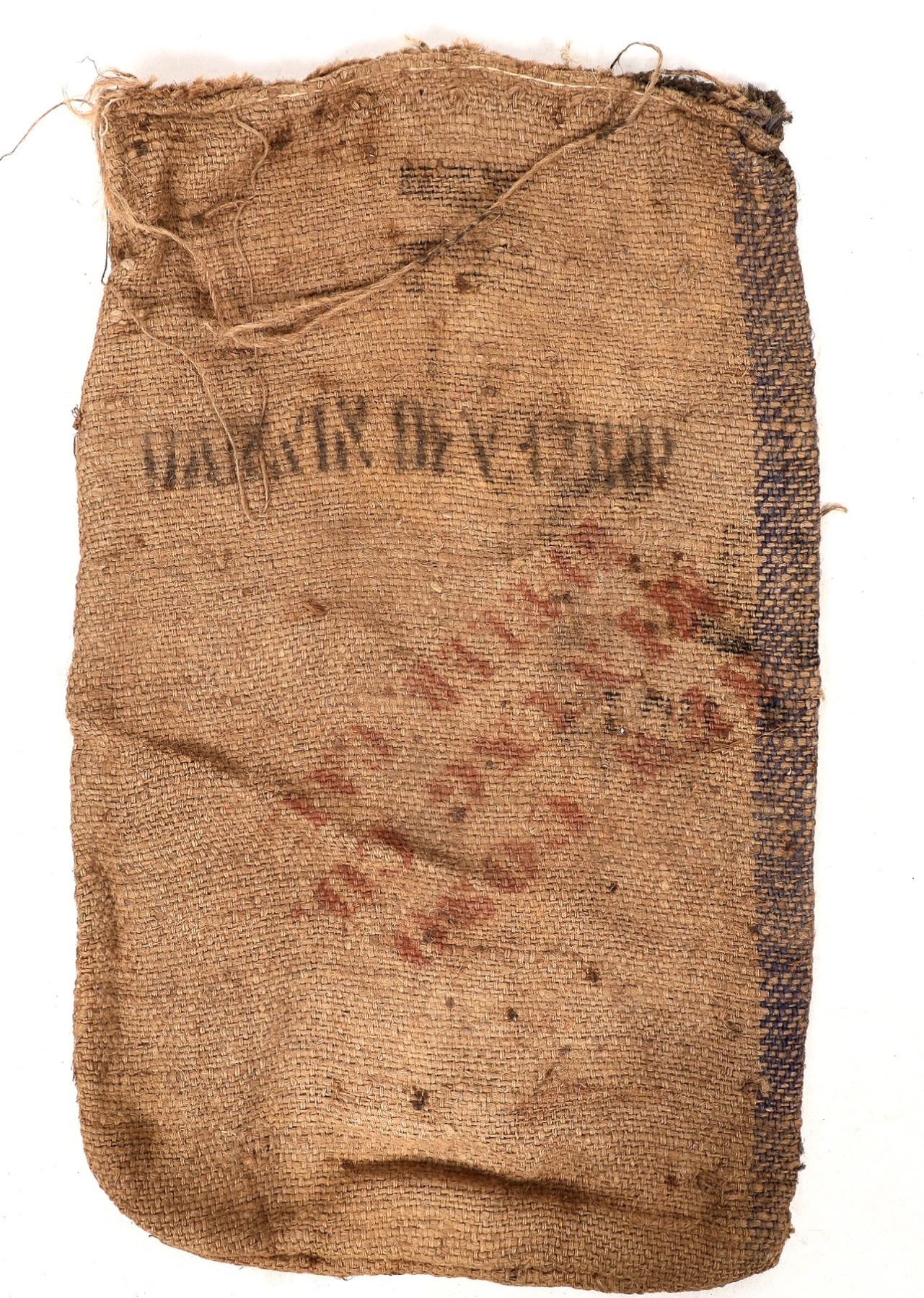 An historic burlap ore bag with bold black 1.5" tall printing on front: "Darwin Dev. Corp," with "New Coso/Mining Co/Keeler, Cal." printed below in red 1" tall letters at an angle and upside down, and a 2.5" wide blue line down the side, c1870s-80s. It is apparently a reused bag originally from the New Coso Mining Co., a company which formed in the 1870s. The approximately 14" x 22" coarse burlap bag would have held silver or lead ore from Darwin Development Corporation, which formed after the Darwin Development Company consolidated the Lucky Jim, Promontory, Lane, and Columbia mines and began the construction of a mill on the Lane property in 1915. It is not known what the blue stripe signifies, but some mining engineers used color coding to indicate the grade of the ore. A few frayed areas front and back, otherwise in very good condition for its age. See photo(s) for more details.