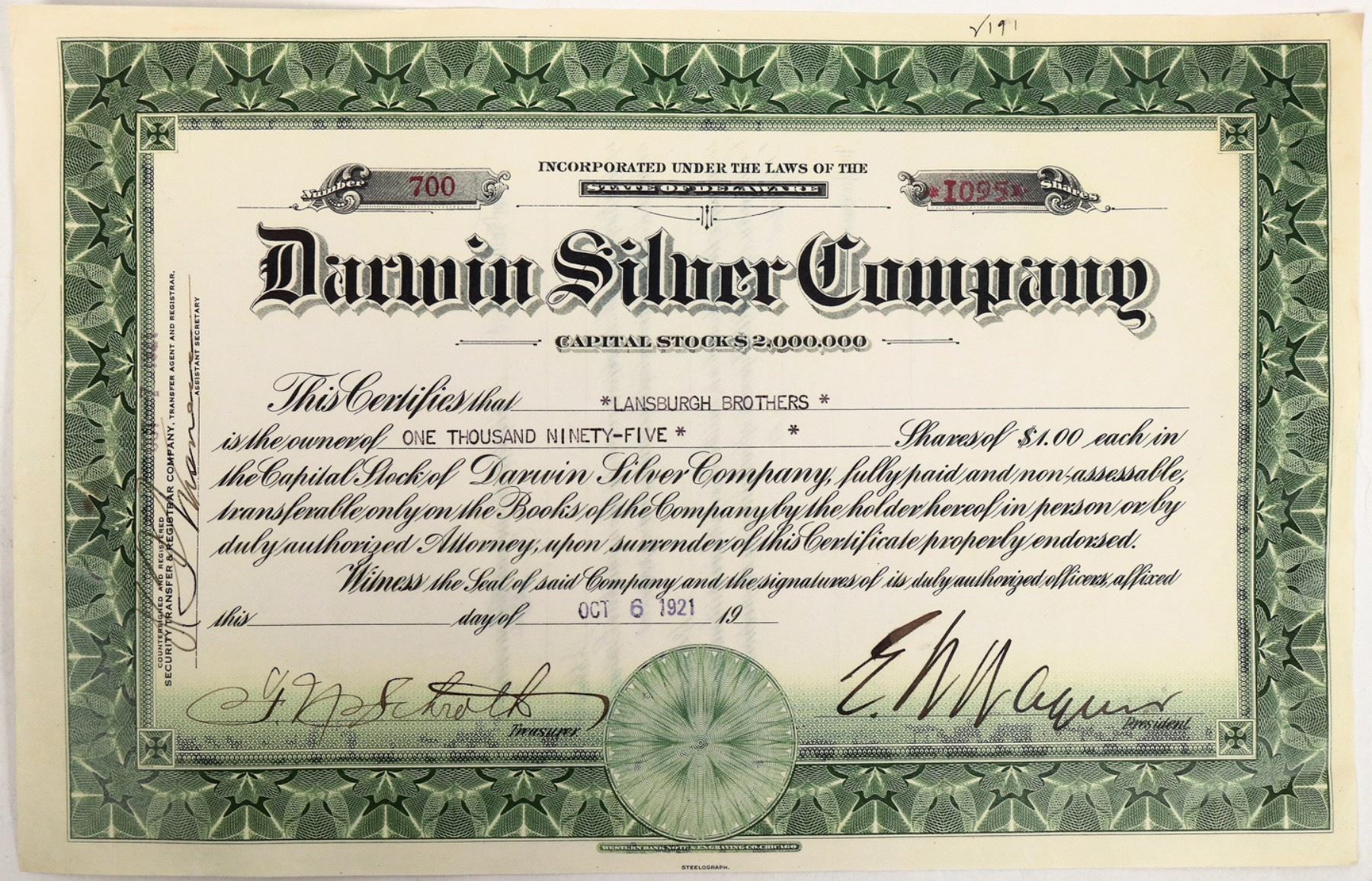 Issued 1921 Darwin Silver stock. Located in Inyo county. Owned the Lucky Jim Mine, situated in the Darwin district, two miles north of Darwin, and twenty-four miles southeast of Keeler.