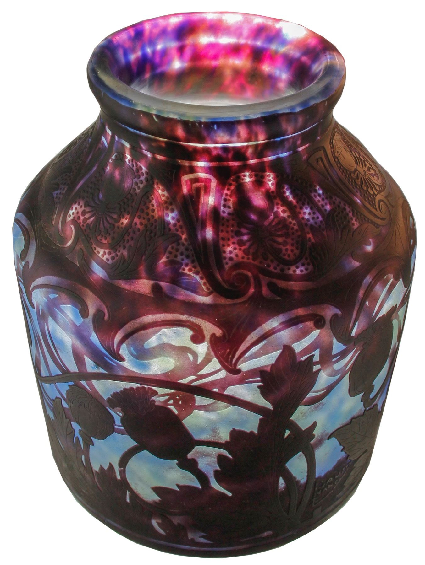 Daum Nancy, France. Spectacular art nouveau glass vase. 7"diameter x 11" high x 4" mouth. Carved black Oriental poppy design on the exterior. This is a classic cased vase. The base has violet and magenta colors. The central portion has blue and rose colors, backed the gorgeous Oriental poppies. The top with blue, pink and orange underneath the engraved black designs. Marked Daum Nancy in the classic early fashion, circa 1900 on lower side. This vase may be one of the all-time classics. As a handmade, three-part constructed glass art vessel, it easily exceeds in beauty any of the examples seen today on the web. It's deserving of close inspection. "Glassware marked Daum Nancy is credited to Auguste and Antonin Daum. These brothers took over a glass factory owned by their father Jean Daum located in Nancy, France during the 1870s. The Daum factory produced watch crystals and utilitarian glassware until the 1890s. The brothers began experimenting with art glass beginning in the 1890s and continued into the early 20th century. They introduced their cameo glass wares at the Chicago World’s Fair in 1893." (Courtesy thesprucecrafts.com) Back-Lit Photo used.