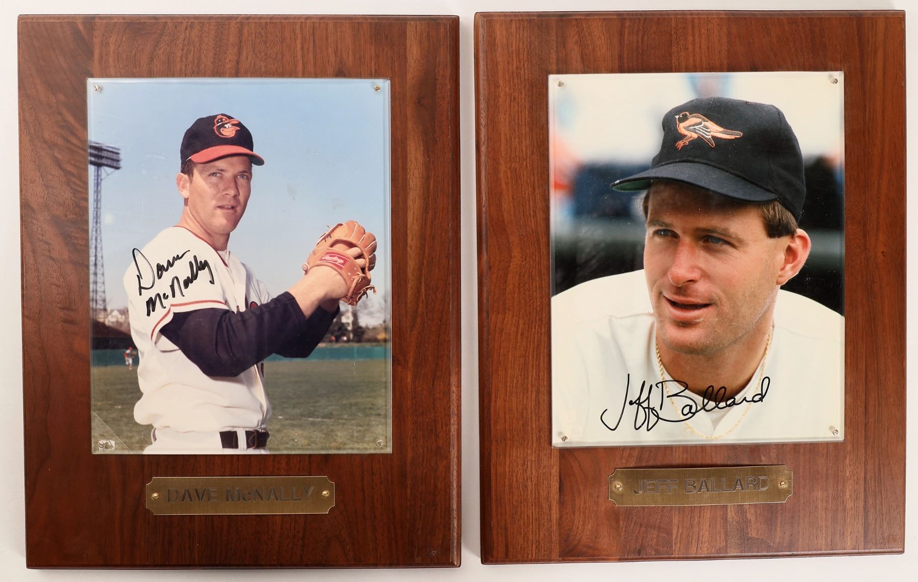 Orioles fans take note of these 2 players from Billings, MT! 2 nice walnut plaques with autographed 10x8" photos of pitcher Dave McNally and Jeff Ballard. Plaques 14.5x12.5".