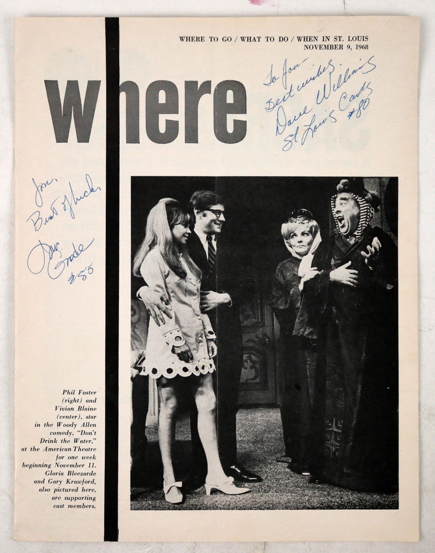 1968 Woody Allen play program autographed by Dave Williams, #80 St. Louis Cards, sadly he did not score any touchdowns that year. Also, Irv Goode #55, a left guard on the kicking team. Center vertical fold.