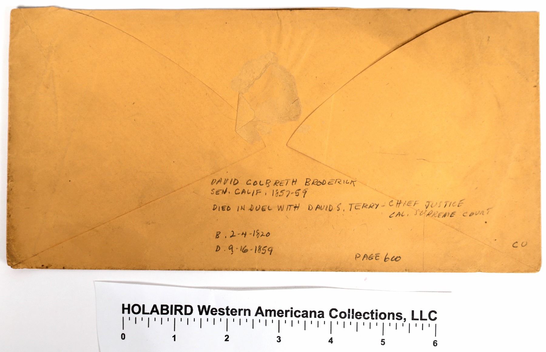California Senator / Private Coin Minter David C. Broderick Autograph on Cover sent from D.C. Broderick, U.S. Senate, to Edwin Carpenter in Schenectady, New York. No stamp or cancel. David Colbreth Broderick came to California in 1849 and worked as a smelter, assayer, and minter of private coinage. Broderick was one of the people who James King of William attacked in the newspapers for allegations that his gold coins were not as represented. He was a delegate to the Constitutional Convention of California in 1849, a member of the State senate from 1850-51, and then a US Senator for California from 1857 to his death in 1859. Just prior to the start of the American Civil War, the Democratic Party of California was divided between pro-slavery and "Free Soil" factions. Broderick led the Free Soilers (those opposed to the expansion of slavery into the Western States). One of his closest friends was David S. Terry, formerly the Chief Justice of the California State Supreme Court. Terry advocated extending slavery into California. Terry lost his re-election bid because of his pro-slavery platform, and he blamed Broderick for the loss. The tensions between the two escalated and led to a duel. Broderick was mortally wounded and died on Sept. 16, 1859. California