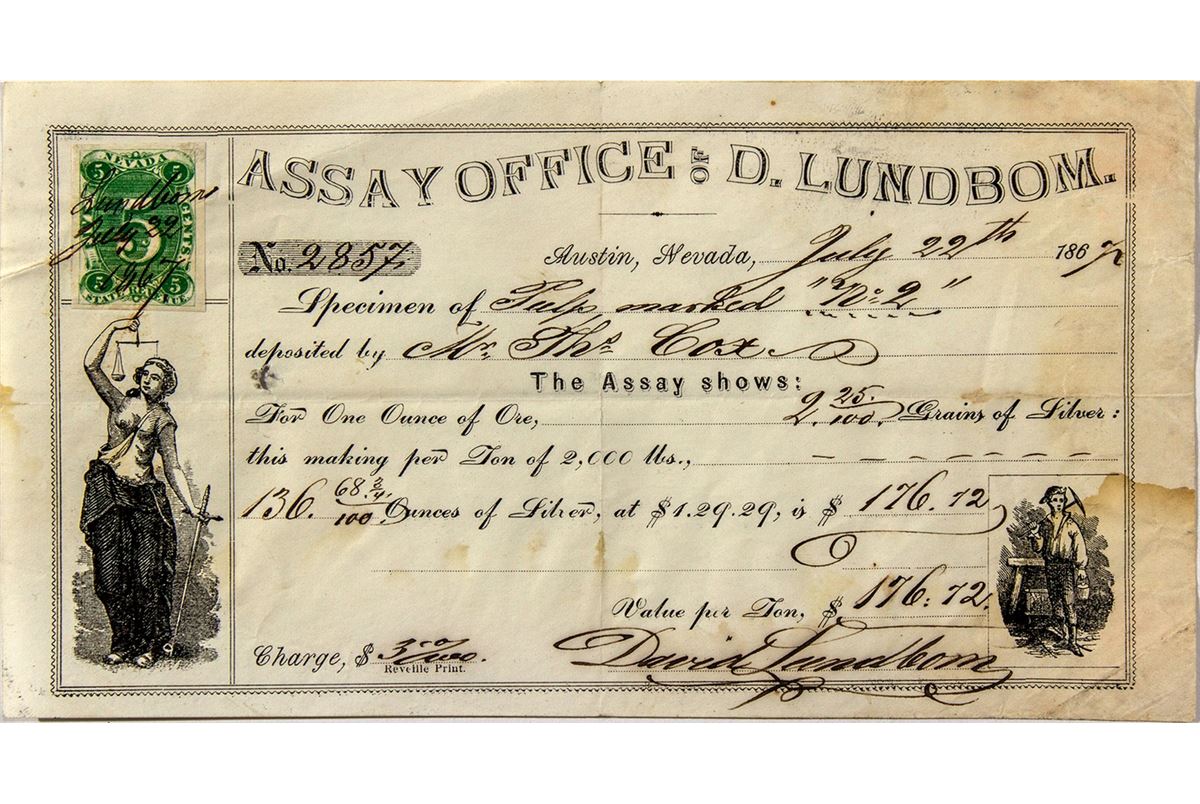 Early 1867 assay receipt from the assay office of D. Lundbom dated July 22, 1867. The offices of D. Lundbon were based in Austin, Nevada This is the assay receipt from a submitted pulp specimen which was deposited by Thomas Cox. It is assay certificate number 2856. The receipt has a small thin black border and two vignettes; one of a lady and a small miner vignette. President Lundbom's signature is on the bottom right. In addition there is a green five cent Nevada revenue stamp signed by Lundbom. Staining on bottom right.