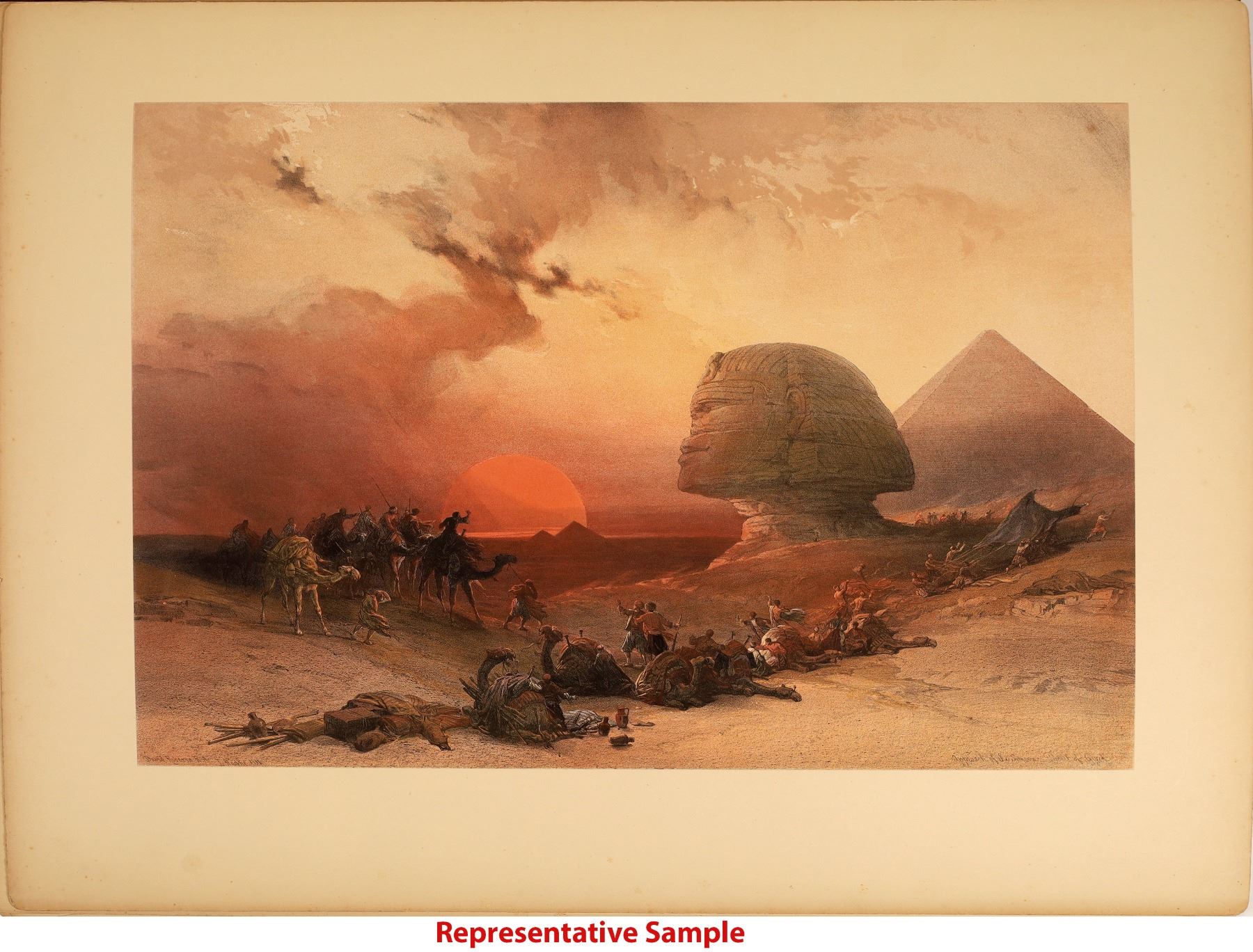 Spectacular collection of 42 original folio lithographs drawn by artist David Roberts (1796-1864) during his visit to the Holy Land in 1838-1839. Roberts published his entire catalog of art from this trip in two forms: a book “The Holy Land, Syria, Ideuma, Arabia, Egypt and Nubia: From Drawings Made on the Spot”; London, F.G. Moon, 1840. Roberts also published these fine art works as folios on a subscription basis between 1842-1849 through Francis Graham Moon. Roberts made 247 separate works over this eight year period. It is known that Roberts had 600 subscribers, though only a very few purchased all. No catalog has ever been published listing all 247 different lithographs to our knowledge.