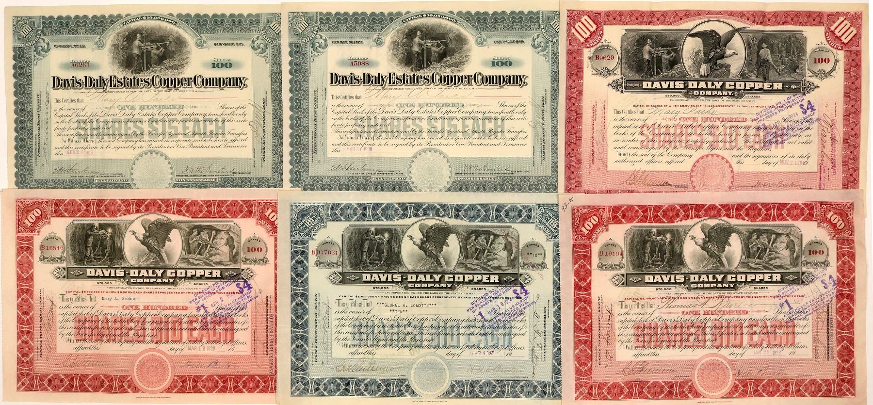 Lot of 6. 1) Davis-Daly Copper Company. Four stocks issued 1916-1923, two different types. Red or blue border, three vignettes (two mining and one of an eagle). Either ABN or John A. Lowell Bank Note Co., Boston. Folds. 2) Davis-Daly Estates Copper Company. Two stocks issued in 1908, not cancelled. Blue green border and background, vignette of miners using drill. ABN. Folds, pinholes. According to the Copper Handbook, Vol. 8, the former company was a reorganization of the latter. The Davis-Daly Estates Copper Co. claimed to have 400 acres bought from the estates of AJ Davis and Marcus Daly, though that claim was disputed. "The Davis-Daly Estates Copper Co. is a swindle, and were justice done the people responsible for the frauds would be jailed." [See long write-up in Copper Handbook, Vol. 8, pg. 618-620] Ken Prag Collection
