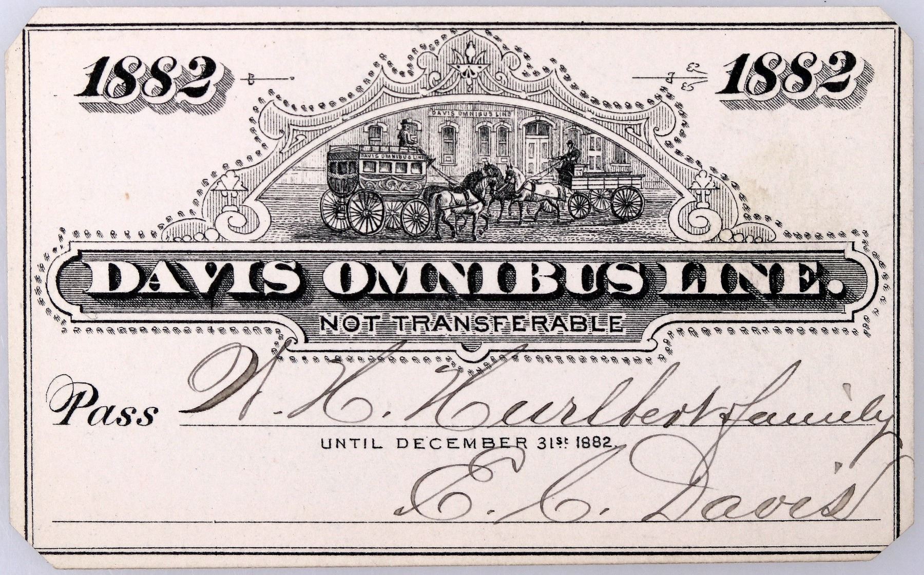 Nice pictorial pass issued to H. Hurlbert & Family for 1882. Signed by EC Davis. Very attractive design with vignette of wagon and horses with company name on the side. Printed on cardstock. Milwaukee stage line founded in 1850 by Davis and Brown. In 1883, they owned 10 buses and 5 express wagons and were located at 305 & 307 Milwaukee Street.