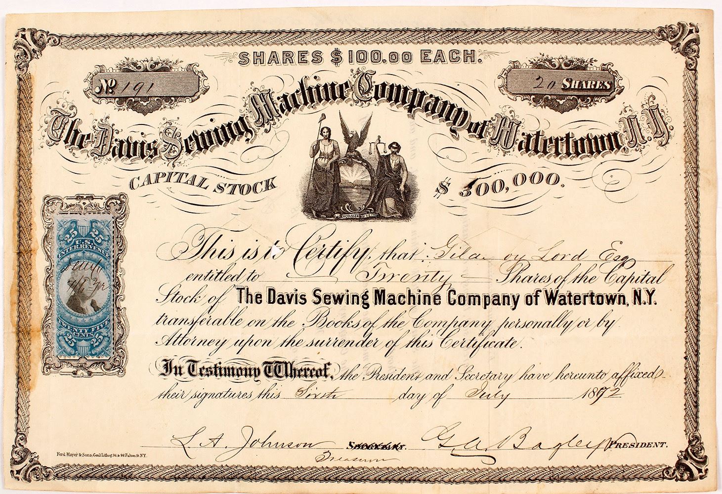 Number 191 for 20 shares to Lord in 1872. Signed by treasurer LA Johnson and president GA Bagley. Blue large 25c Revenue Stamp. Allegorical vignette. Excellent condition except for one hole. In the mid-1860s Job Davis, an inventor, traveled to Watertown and displayed his Davis Sewing Machine at the Woodruff house. The Davis machine was a great improvement over the sewing machine previously invented by Elias Howe and it aroused the interest of brothers John and Joseph Sheldon. In February 1868, the Davis Sewing Machine Company was started in Watertown by the Sheldons with a capital of $150,000, which was quickly increased to $300,000. Date: 1872 Location: Watertown, New York HWAC# 54567