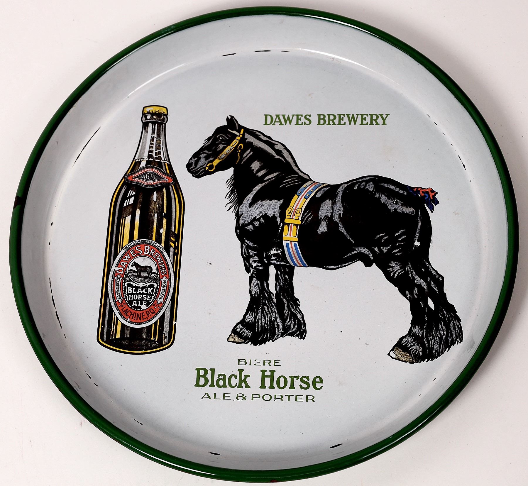 Dawes Brewery Biere Black Horse Ale & Porter porcelain enamel tray. In good shape. Slight wear on bottom edge and a chip at top left. Nice coloring on front, including a beautiful black horse. Montreal, Quebec. c. 1930s. Measures 12" in diameter. Please see photos for details and condition. Canada