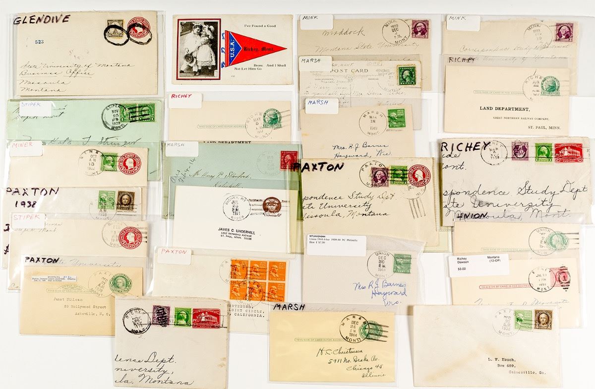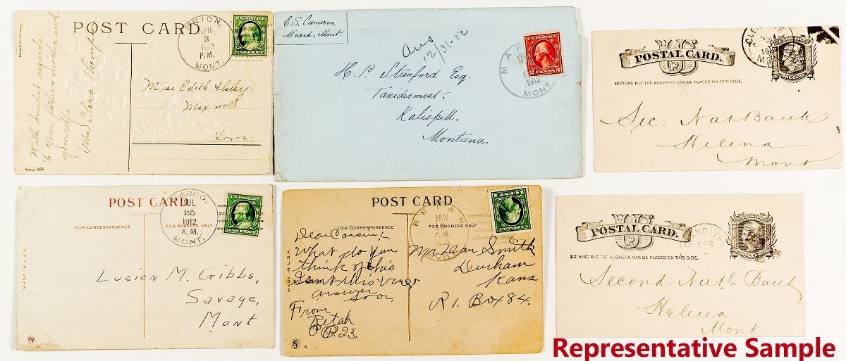29 total. 2 Glendive territorial. 1915 Retah (1910-1918). 1912 Union early. 1912 Marsh early. 1912 Marco (1909 to 1918). Also includes Stipek, Mink, Miner, Richey, and Paxton cancels. City: State: Montana Date: Inventory# 38567