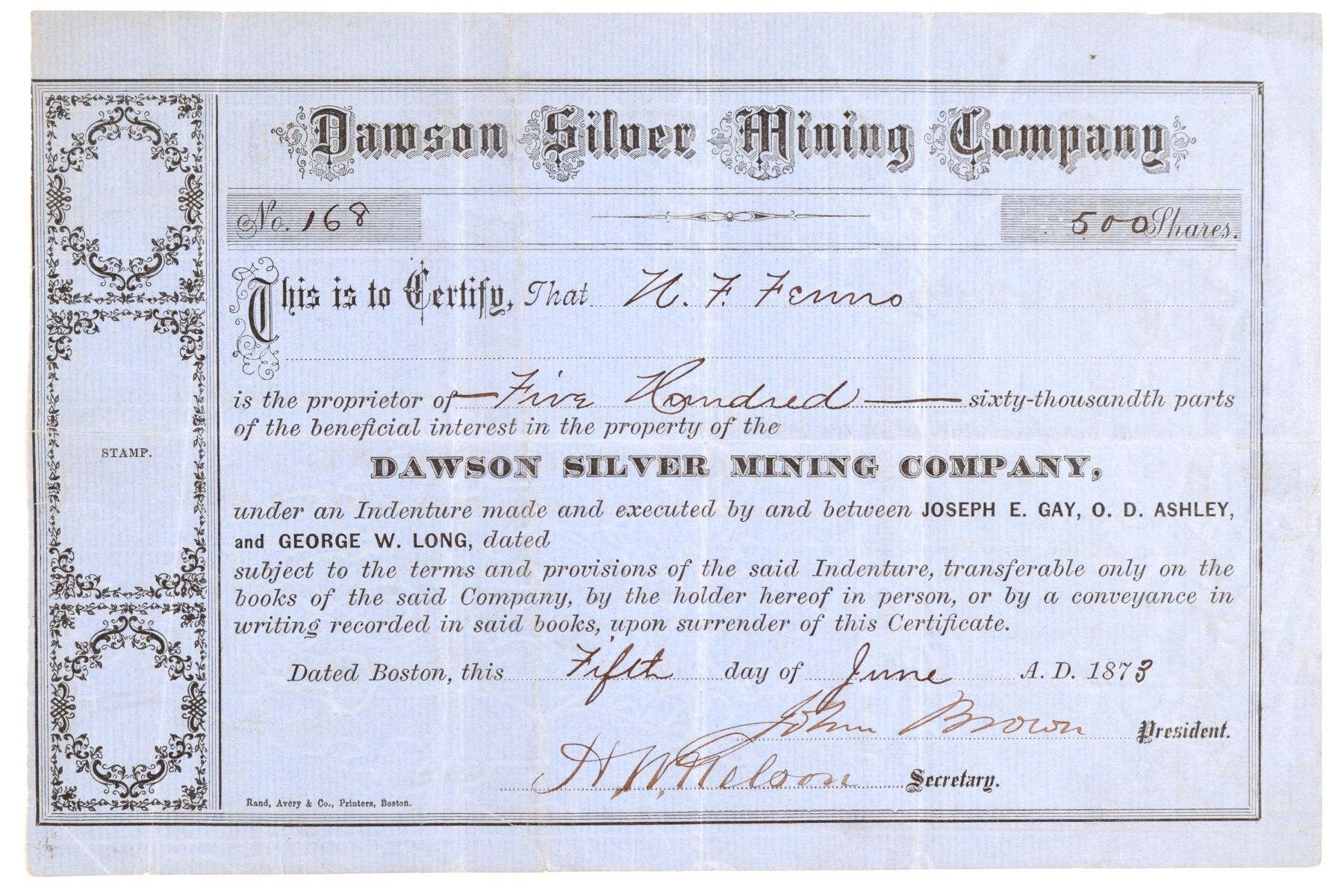 Possibly Colorado. No. 168, issued for 500 shares to N.F. Fenno on June 5th, 1873 in Boston. Signed by president John Brown and secretary H.W. Nelson. Not cancelled. Black print on blue paper. Printed by Rand, Avery & Co., Boston. Many folds and creases, one inch separation. 6 x 9" Not in Filer or other Holabird indexes. No articles found on CHNC. Listings on newspapers.com only mention trading value, but not location. Not in Corbett.  City:   State: Colorado  Date: 1873