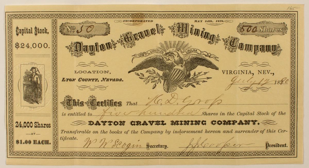 Dateline Virginia, Nev., July 12, 1880. Location: Lyon County, Nevada. Patriotic eagle vignette. Issued to H.D. Grop for 500 shares. Signed by J.J. Cooper (president) and W.W. Scogin (secretary). Folds and small stain. 9.75" x 5.25" Prag Collection City: Virginia City State: Nevada Date: 1880 hwac# 22702