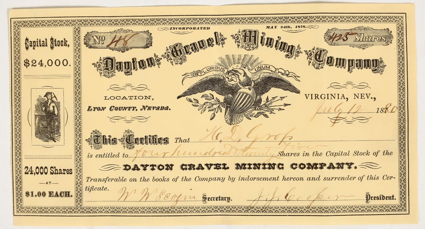 Inc. 1878. Location: Lyon County, Nevada. No. 48, issued for 425 shares to HD Grop on July 12th, 1880 in Virginia City, Nevada. Signed by president J.J. Cooper and secretary WW Scogin. Not cancelled. Black print on yellow paper. Patriotic eagle vignette and prospector vignette. Folds, very nice. 5.25 x 9.75" According to E&MJ, Vol. 29 (1880), the shaft of the company at the mouth of Gold Canyon was down to bedrock (24 ft.). There was a 4 ft. streak of pay gravel which will average 20 cents to the pan. They were mining gold placer at Dayton and Gold Canyon.