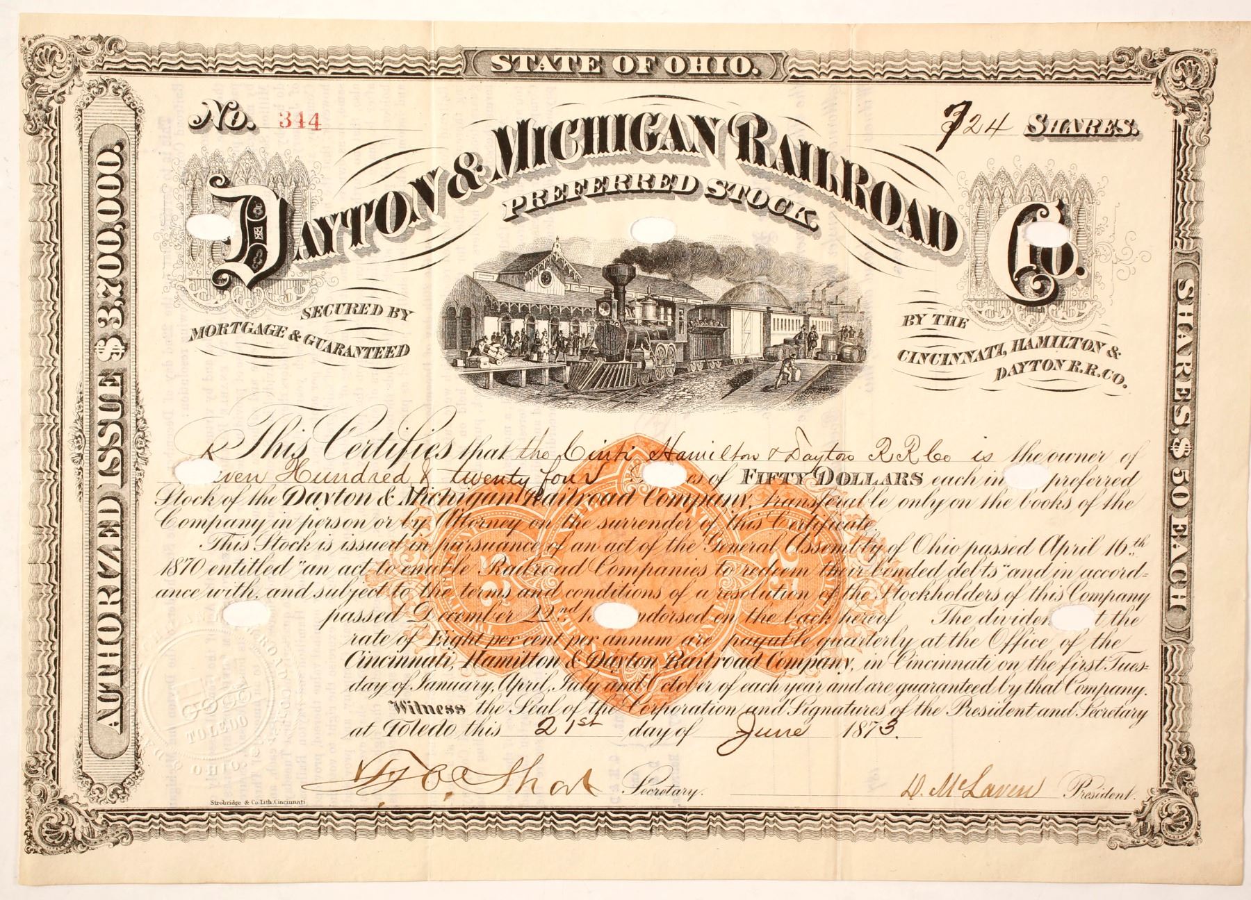 Cancelled 724 preferred shares of Dayton & Michigan Railroad number 314 issued to Cuiti Hamilton & Dayton Railroad Company, dated June 21, 1873. signed by D. McLaven, President and T. B Short, Secretary. Imprinted Revenue stamp RNU1. Vignette of train in station. Grey border. Raised company seal. Railroad located entirely within Ohio, covers 140 miles with 14 miles of second main track. Railroad is reason for growth and development of Wapakoneta. Dayton and Michigan Railroad began operation in 1858, giving the people of Wapakoneta first railway connection, first railroad in Auglaize County and first north-south line in western Ohio. Provided a route from Lake Erie to the Ohio River, which allowed local farmers and industrialists to ship their products and goods throughout the country, promoting economic development. Within a short number of years employment and population more then doubled between 1860 - 1870. Later railroad know as Cincinnati, Hamilton, and Dayton Railroad. (K C's Dayton and Michigan Railroad History) Listed in Castenholz Printed: Strobridge & Co. Lith, Ken Prag collection. State: City: Date: HWAC# 83714