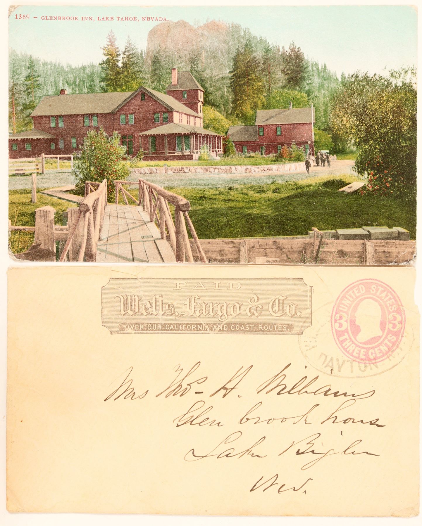 c1864. Wells Fargo stamp says 'Territory, but address just says 'Nevada.' Very nice Dayton N. T. stamp. Addressed to" Mrs. Thomas H Williams, Glen brook house, Lake Bigler, Nev. Extensive history on naming of Lake Tahoe (Bigler), info on Glenbrook house included. Biography of General Thomas Williams (while this area was part of the Utah Territoy sold two lots in Empire City, owned a toll road, had very early mills, was a Nevada Assemblyman, represented the Central Pacific Railroad in the trial of the Great Verdi Train Robbery, argued that a man of color has the right to sit on a jury - he lost this one.) Background information on the naming of Lake Tahoe.