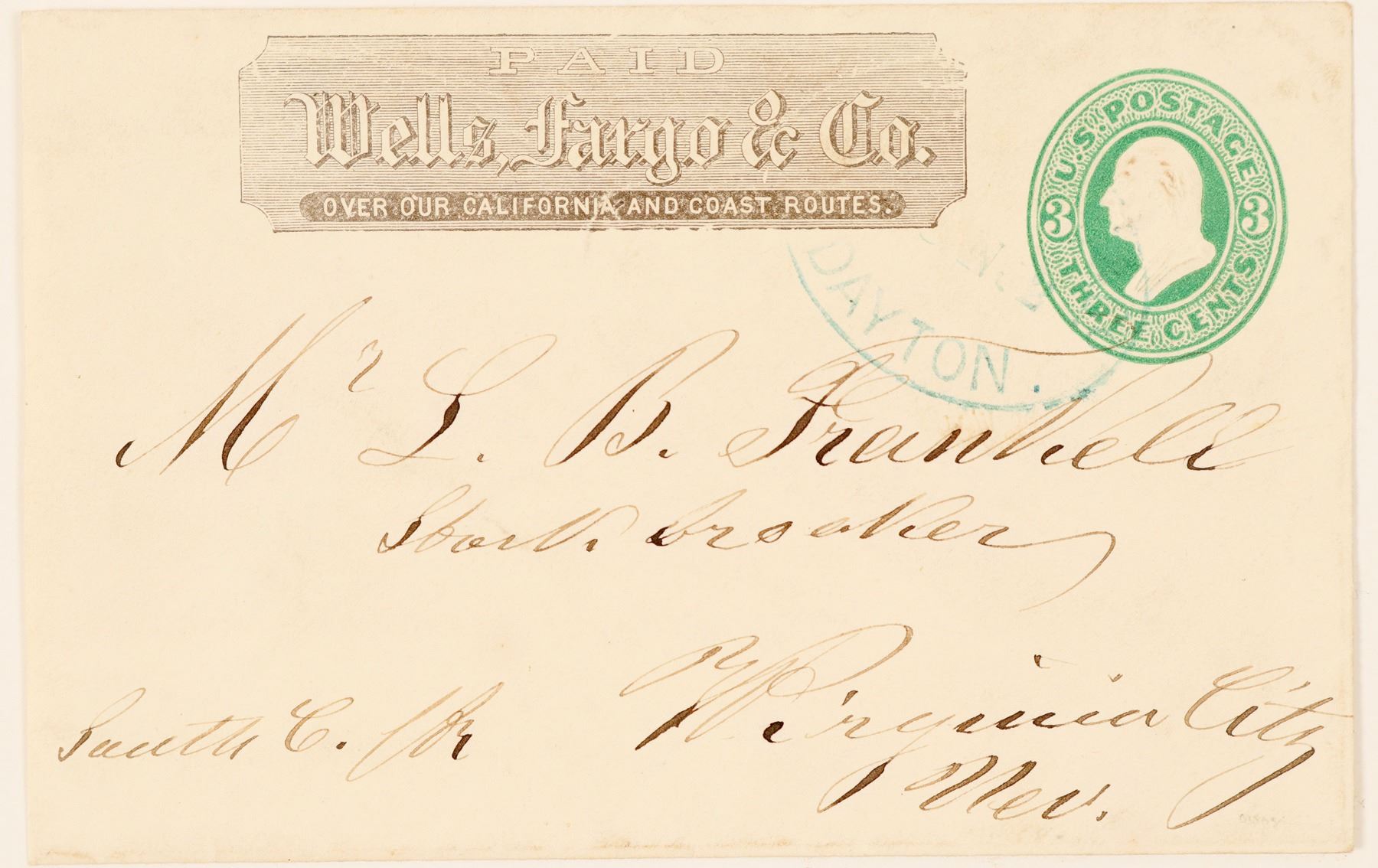 DAYTON' in cancel is very strong. Addressed to LB Fankel of Viginia City. Biography on the great embezzler. New York Times article entitled "Gone off with a million". Brother almost killed leaving Virginia City heading to San Francisco on the train.