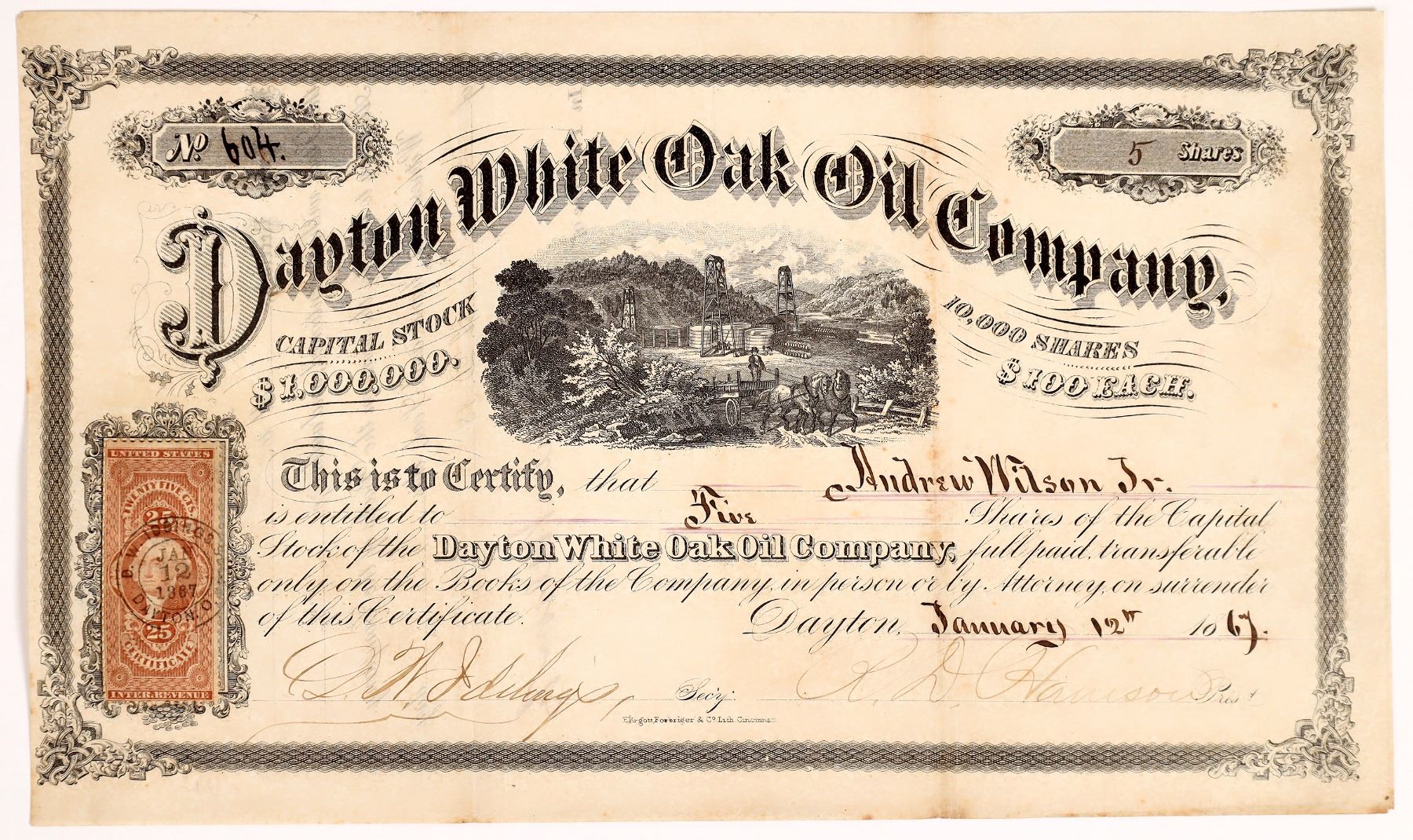 No. 604, issued for 5 shares to Andrew Wilson Jr. on January 12th, 1867, in Dayton, Ohio. Signed by president RD Harrison and the secretary (illegible). Not cancelled. Black border and print. Nice detailed vignette of oil derricks and horse-drawn cart. Printed by Ehrgott, Forbriger & Co., Cincinnati. 25 cent US IR stamp with tied cancel attached at left. 6 x 10" Folds, some toning. According to an article mentioning their incorporation in July 1866, the company's office was in Dayton, Ohio, but oil properties were in West Virginia. No other information located.