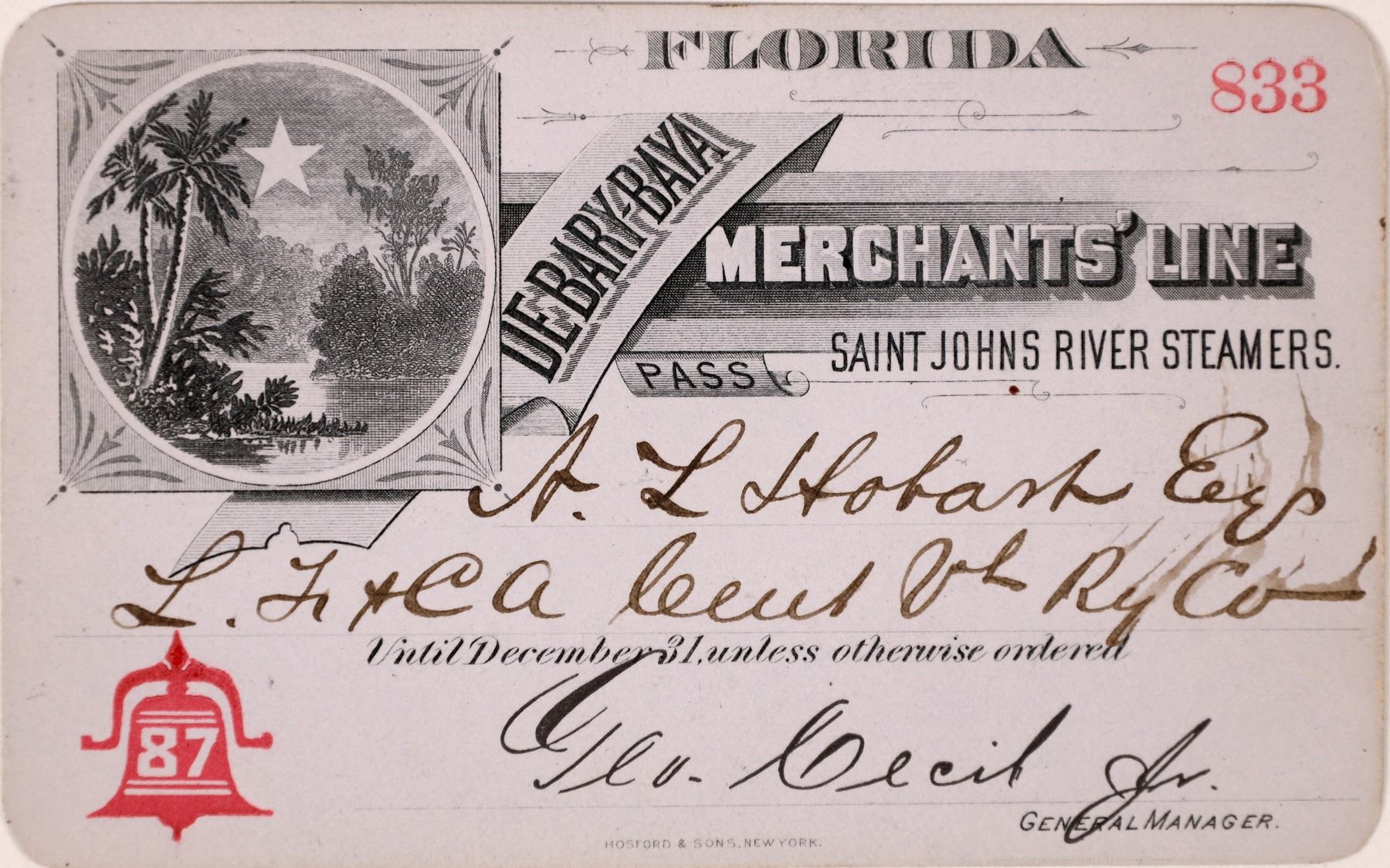 "Saint Johns River Steamers" printed under title. "Florida" printed at top. Pass no. 833, issued for 1887 to AL Hobart of the Central Vermont Railway Co. Preprinted signature of general manager Geo. Cecil Jr. Red bell with year in lower left corner. Vignette of tropical scene with star in the sky. Printed on light purple cardstock. Hosford & Sons, NY. Colonel Hanero T. Baya ran a grocery business. In 1874, he purchased the steamer GAZELLE, WATER LILY in 1879, PASTIME in 1880, SYLVAN GLEN in 1881, and MAGNOLIA in 1882. In 1882, the steamboat H. T. BAYA was built in Philadelphia. On March 28, 1883, Baya's Line merged with Frederick de Bary's DeBary Merchants' Line to form the DeBary-Baya Merchants' Line.