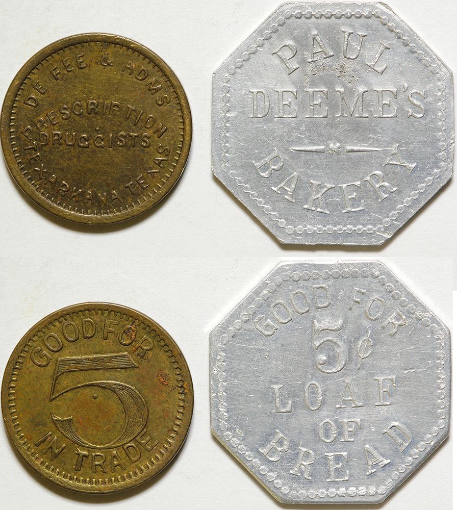 Two tokens from Texarkana which is located on the Texas Arkansas border and was a RR town in the 1850,s HWAC# 52067 Date: Location: Texarkana, Texas