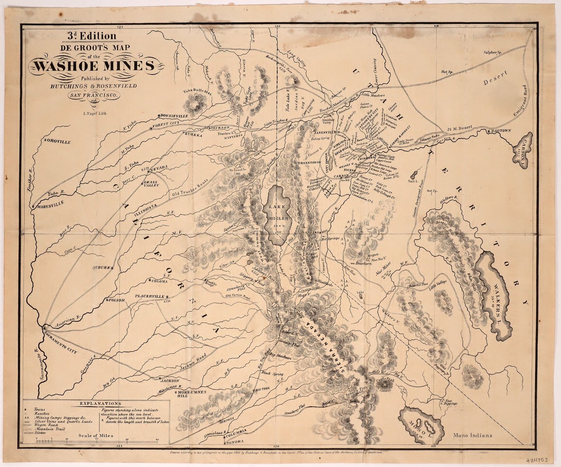 Chinatown is shown where Dayton exists today. Washoe lake is shown adjacent to Franktown, as is the boiling spring at what later became Steamboat. The old road that went up Geiger grade is shown along with the short lived town of Janesville, now near the intersection of the VC highway and Toll Road. The map is bounded by Marysville on left edge center, Sacramento City lower left, Sonora lower center, Mono lake lower right, along with nearby "new diggins" soon to be named Monoville. Bound by Walker Lake at right center and Ragtown upper right. The old immigrant road from Salt Lake shows passing through Ragtown. The Beckwourth Pass route, top center, is shown coming into the Truckee Meadows. The original Western States trail, used by so many emigrants inclusive of the Grosch brothers, shows as the “Old Truckee Route” that passes by “De Groot lake,” a name applied by DeGroot himself that was the subject of controversy at the time and did not stick. The “Old Carson Road” is shown leading to Silver Lake and Carson Pass. No prospect symbols are shown near the future site of Silver Mountain, though there is a notation "Silver L. V." near that location.