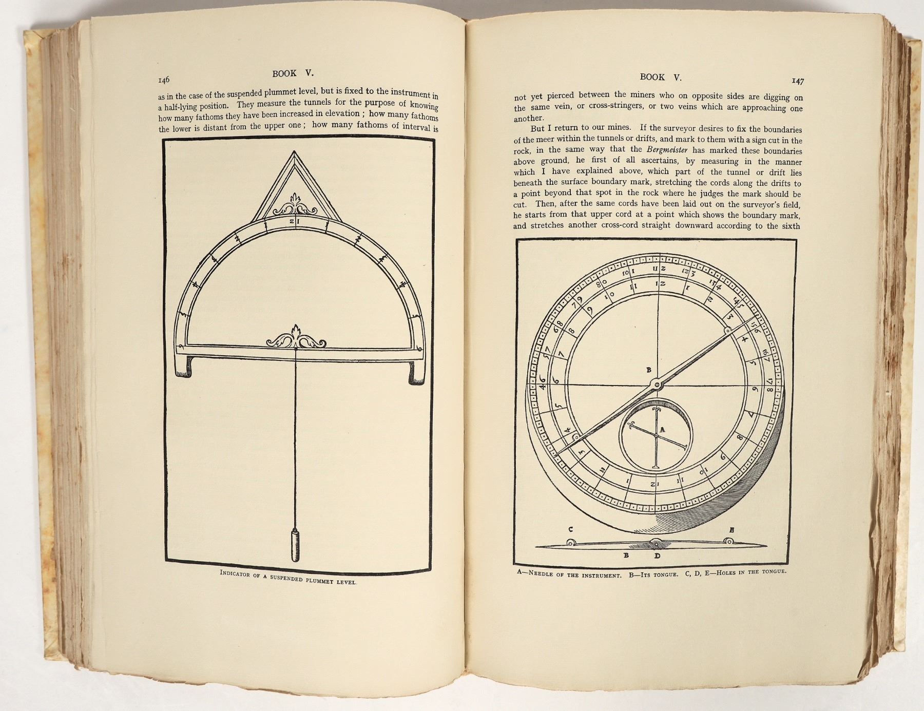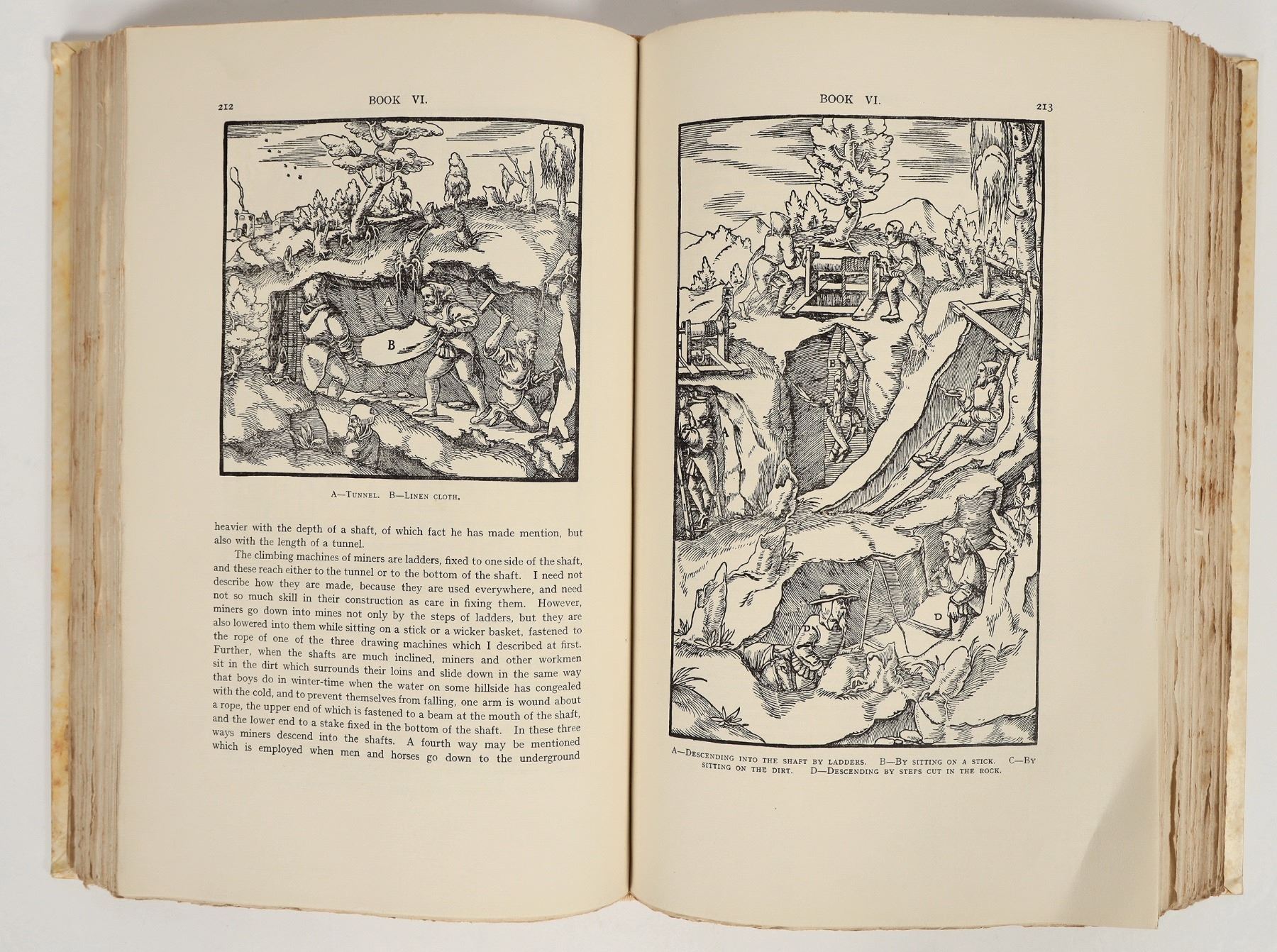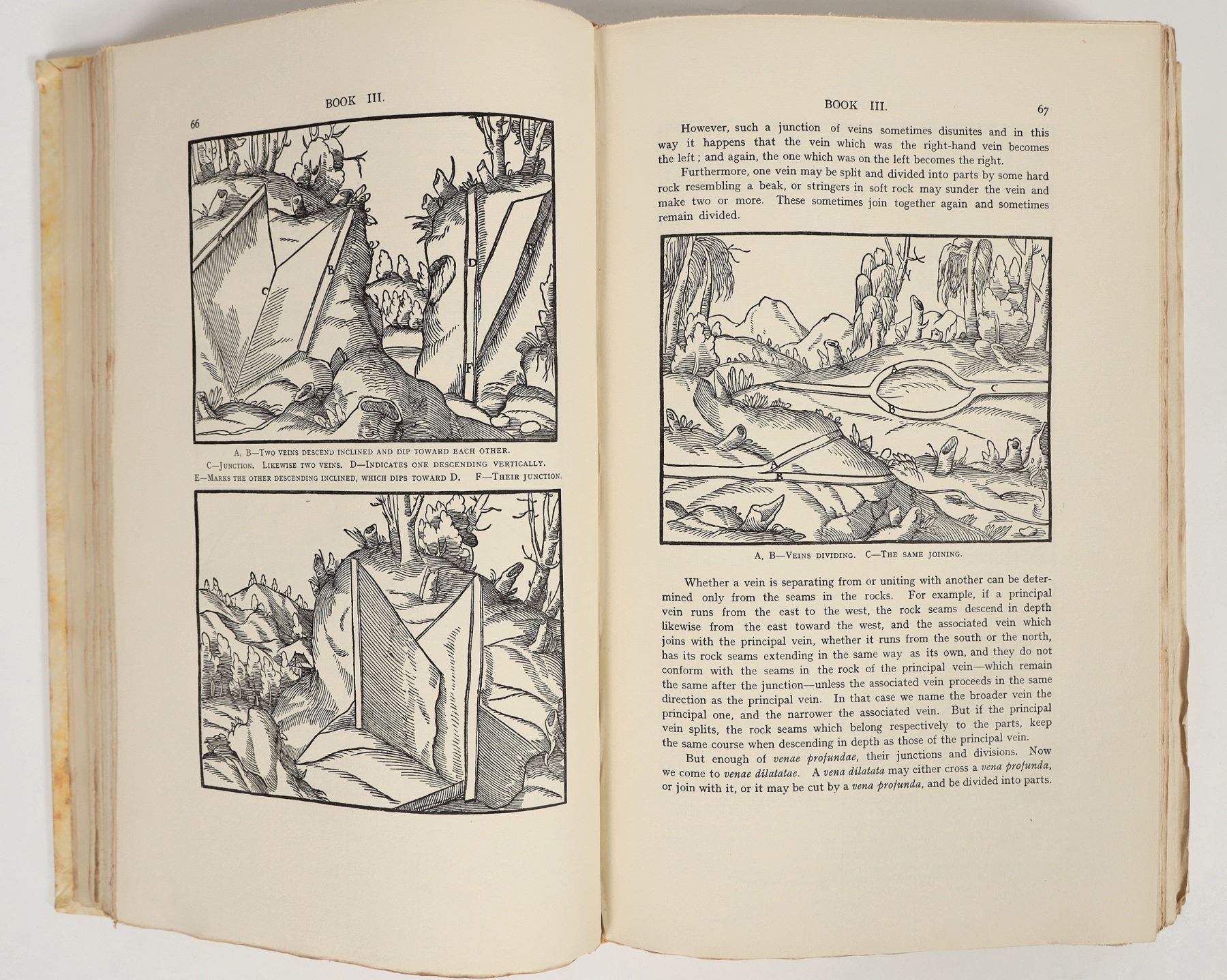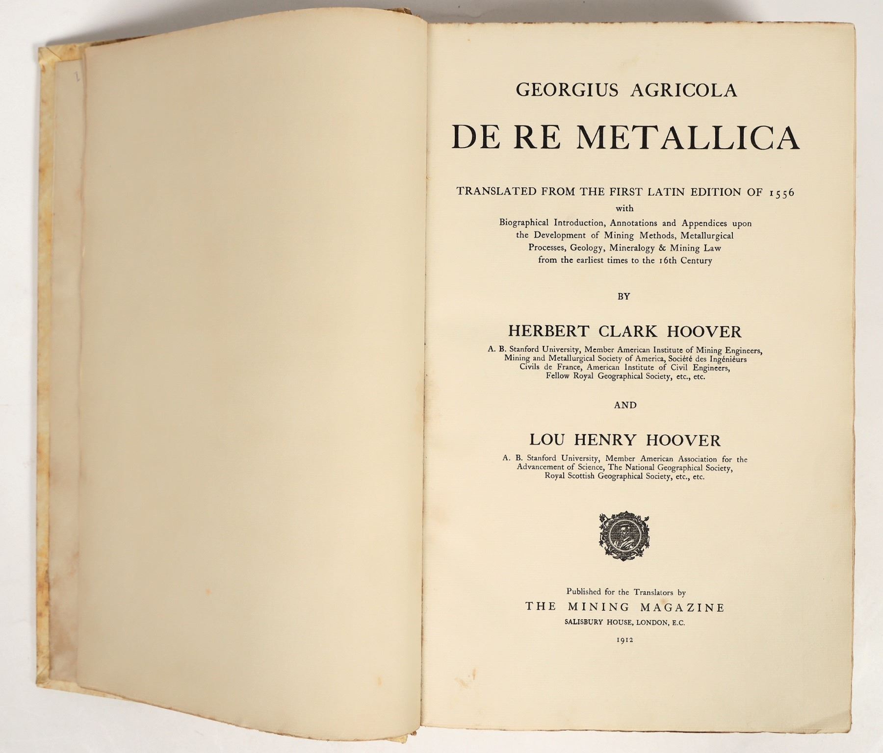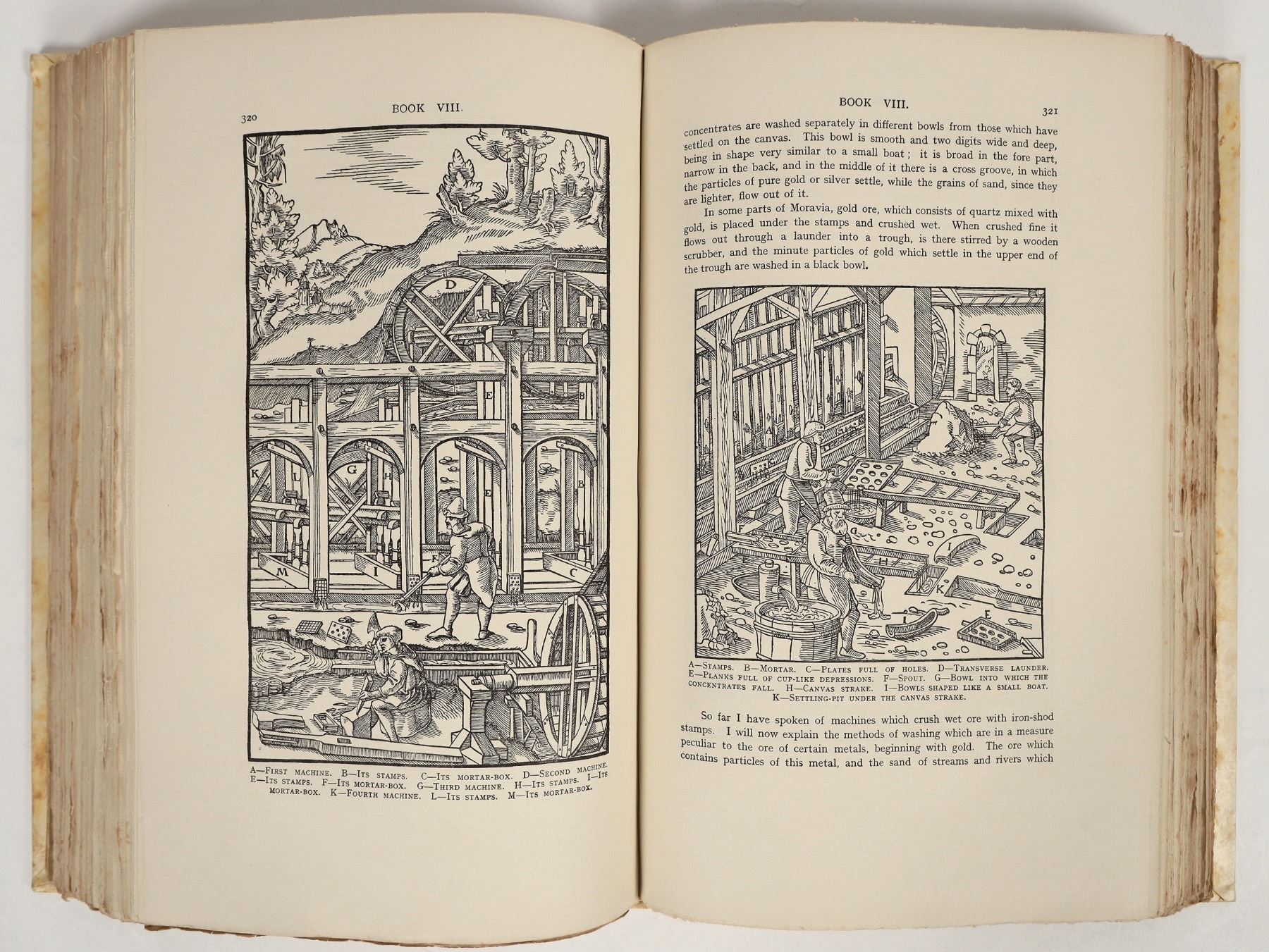 Spectacular and important. 640pp. 14 x 9" in custom slipcase. Choice condition with many illustrations. Originally written in Latin in 1556 by Georgius Agricola, widely considered the "father of mineralogy." First complete English translation, published in 1912 by The Mining Magazine in London. The translation was undertaken by Herbert Clark Hoover (future U.S. president, then a mining engineer) and his wife Lou Henry Hoover, a geologist and Latin scholar. It includes not just translation but also annotations, biographical introduction, and appendices that place Agricola's work into the broader development of mining, metallurgy, geology, mineralogy, and mining law. De Re Metallica (On the Nature of Metals) is the most important Renaissance text on mining and metallurgy. It covers mining methods, surveying, equipment, ore assaying, smelting, refining, mine law, and mineralogy as known in the mid-16th century. Agricola combined classical scholarship with direct observation in Saxon mining districts, producing the first systematic, scientific study of mining.