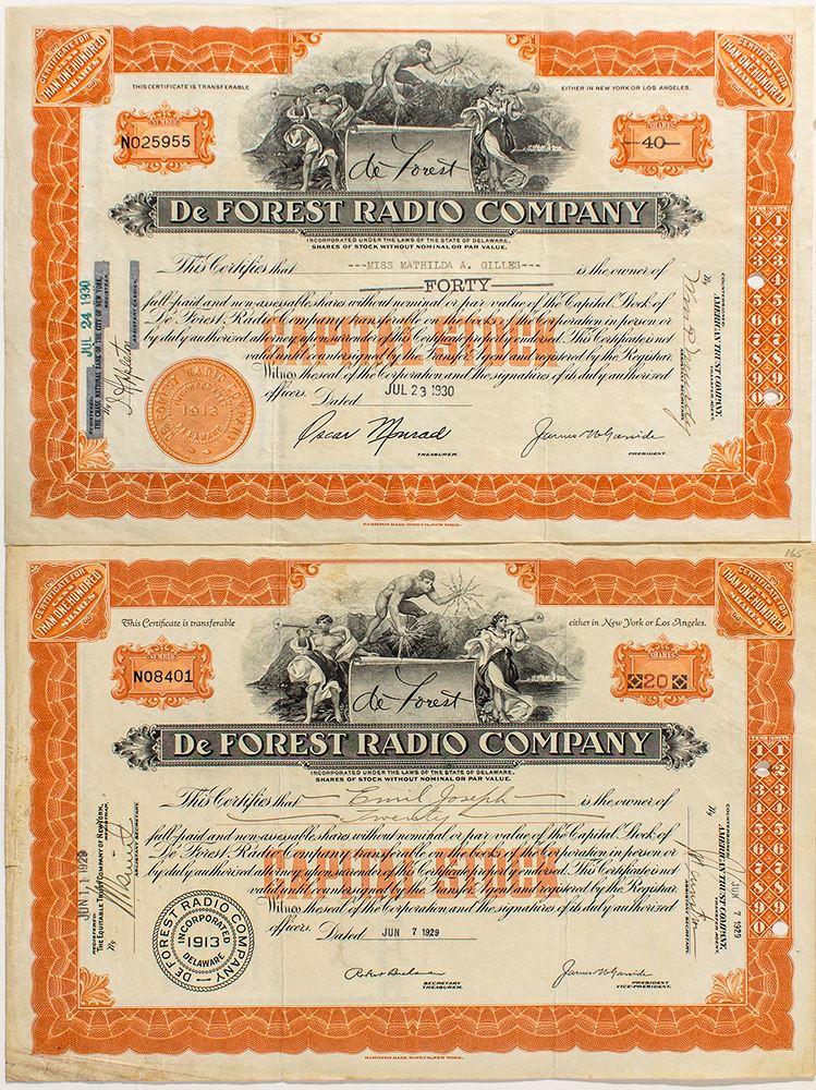 Two certificates of the DeForest Radio Company, one issued to Emil Joseph, the other to Miss Mathilda A Gilles