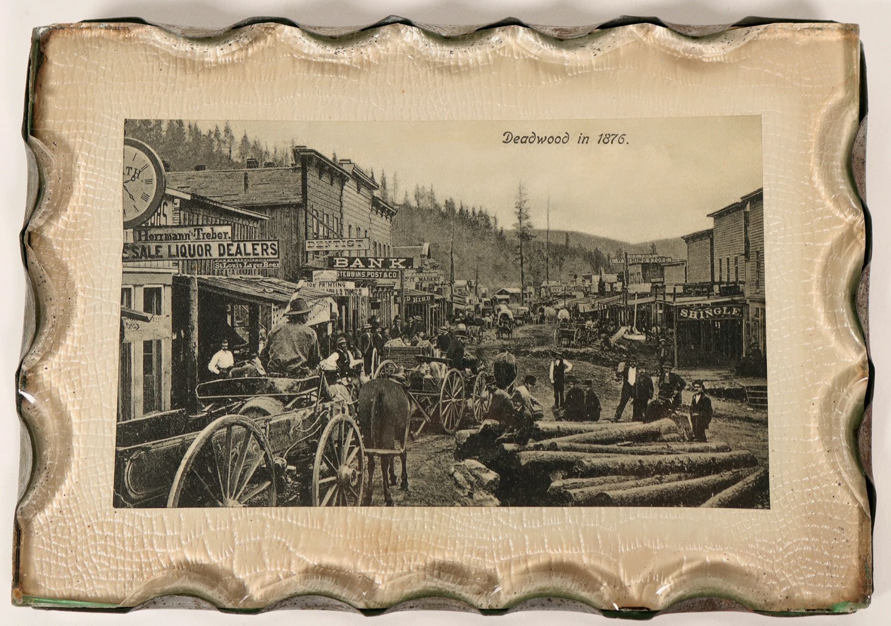 High contrast scene of Deadwood. Find Hermann & Treber Liquor to dentist, dry goods, bank, drug store, etc. Street is crowded with wagons, tree trunks, and men. Glass is scalloped and hold an etched paper as a frame. Reverse says, "Patent App'd For" Reverse shows wear, front is Very nice with small chip upper left. Dimensions 6.5"x 4.5"
