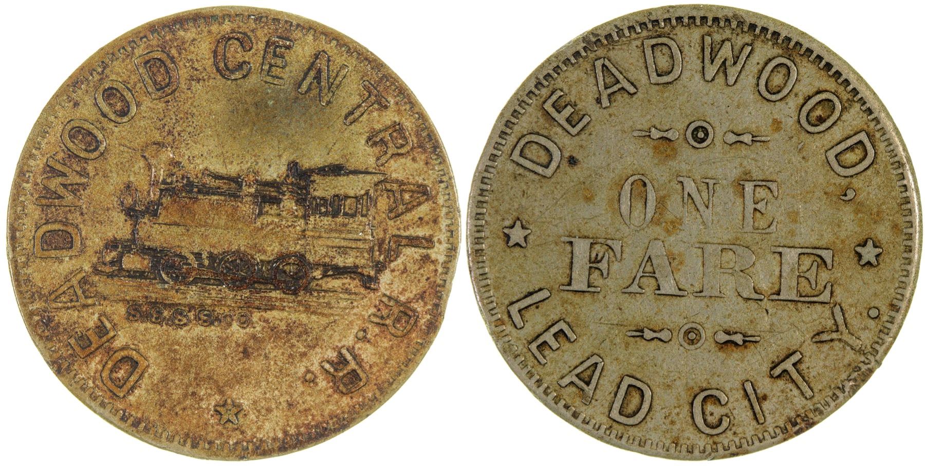 Pictorial locomotive token: DEADWOOD CENTRAL R.R. / (Locomotive) / S.S. & S. CO. // DEADWOOD, / ONE / FARE / LEAD CITY.; Wm, rd., 26 mm. City:Deadwood State:South Dakota Date: