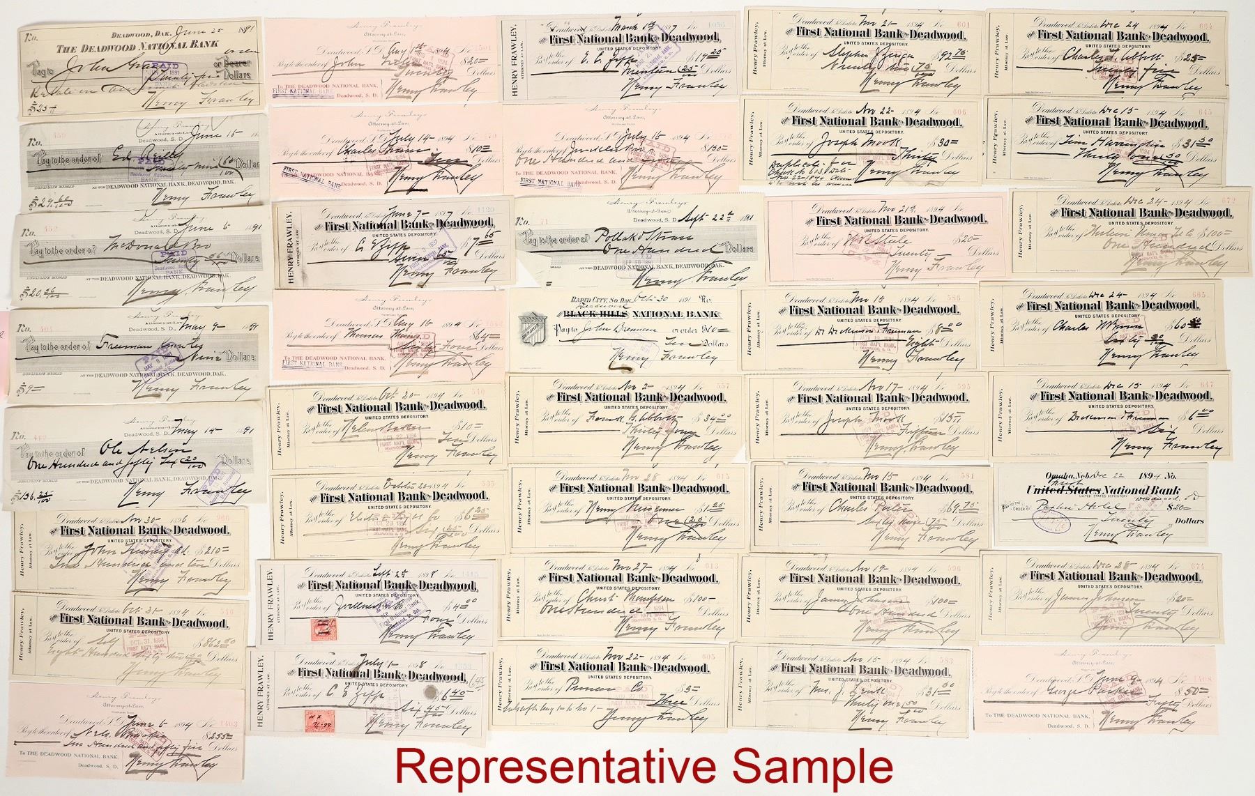 This is a spectacular archive of 1,600+ checks from Henry Frawley, a prominent Deadwood lawyer. This archive was previously unknown to us. The collection is mostly pre-1900 with the following rough breakdown: 1880s (300 checks), 1890s (750 checks), 1900-09 (about 200 checks), 1910s (300 checks), and 1920s (about 125 checks). We have pulled pieces from this archive to make many fun lots of different categories and topics, but this lot is the bulk of the archive. Henry Frawley arrived in Deadwood on a stagecoach on July 4th, 1877, roughly a year after Custer's defeat at Little Bighorn and Wild Bill Hickock's murder in the No. 10 saloon at Deadwood. Seth Bullock had just been appointed sheriff five months prior. The camp was booming. Frawley, born to Irish immigrant parents in New York, pursued his education at the University of Wisconsin in Eau Claire, earning a law degree in 1876. He initially practiced law in Wisconsin but soon moved to the Black Hills, where he began a legal career that included several partnerships, most notably with Edward L. Kohen and later John P. Laffey. In 1890, he became the resident attorney for the Burlington and Missouri Railroad, the same year he married Cristina Anderson, heiress to a ranch in the Centennial Valley. By 1892, Frawley had established his own ranch, which grew into a 3,000-acre operation renowned for its draft horses and distinctive horned Hereford cattle. Henry's legal practice continued to grow, and over time included partnerships with his brothers James and Edward, the latter forming the firm Frawley and Frawley in 1903. The firm represented major mining and banking interests, including the Golden Reward Consolidated Gold Mining Company and the American National Bank. Beyond his legal and ranching success, Henry was recognized for his intellect and extensive personal library. His ranch became a model of development in the region, with lasting structures like stone barns, a schoolhouse, and well-furnished residences‚ many of which still stand. Today, his descendants remain in the northern Black Hills, preserving his legacy.