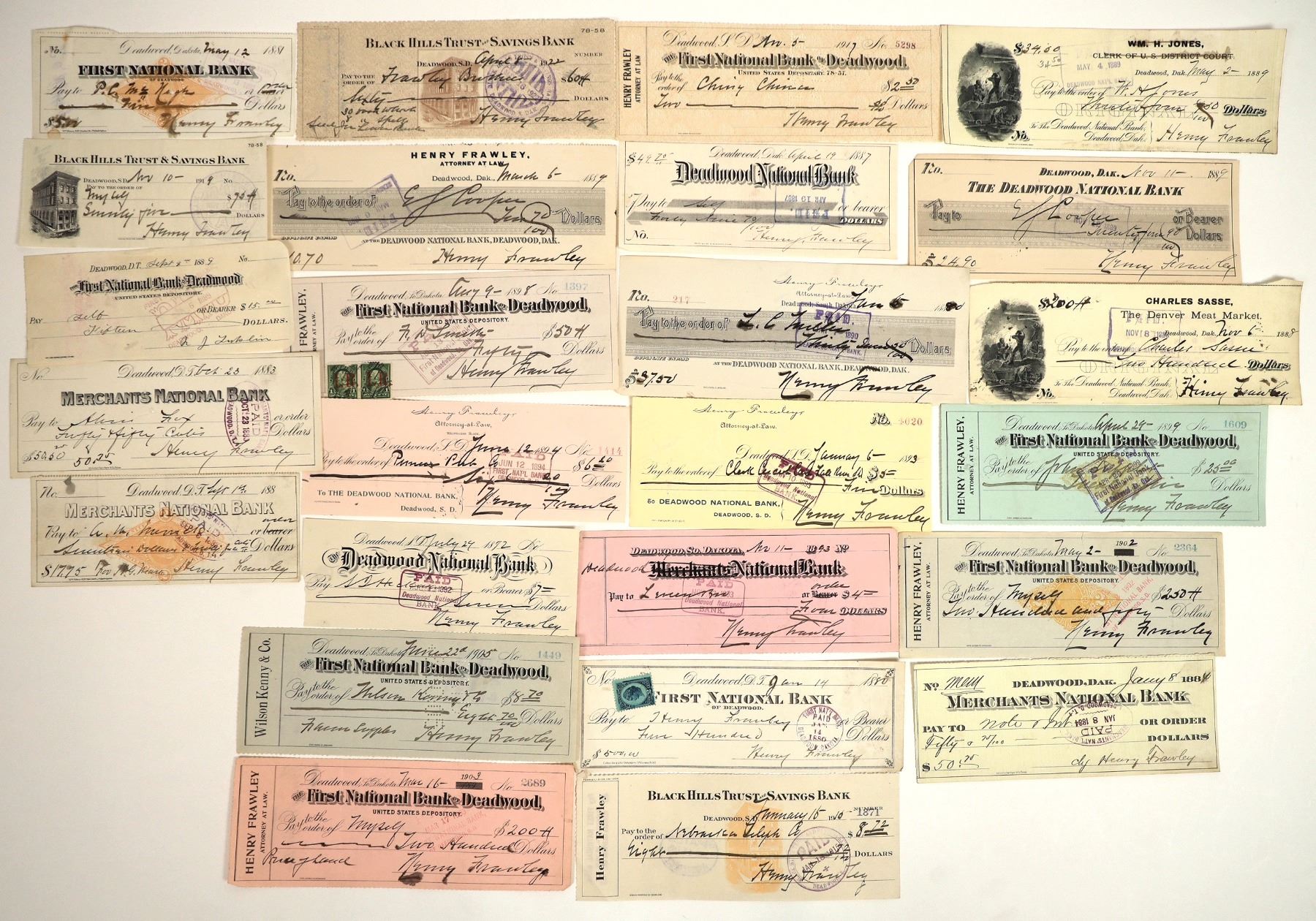 An excellent collection of 26 different checks, 1880s-1920s. These came out of the archive for Deadwood lawyer Henry Frawley. Includes: eleven 1880s checks (two RN, two pictorial); seven 1890s checks (1 RN); three early 1900s checks; three 1910s checks; and two 1920s checks. This collection was carefully assembled out of 1,700 checks. Very difficult to find this variety and so many 1880s-90s pieces. Please inspect.