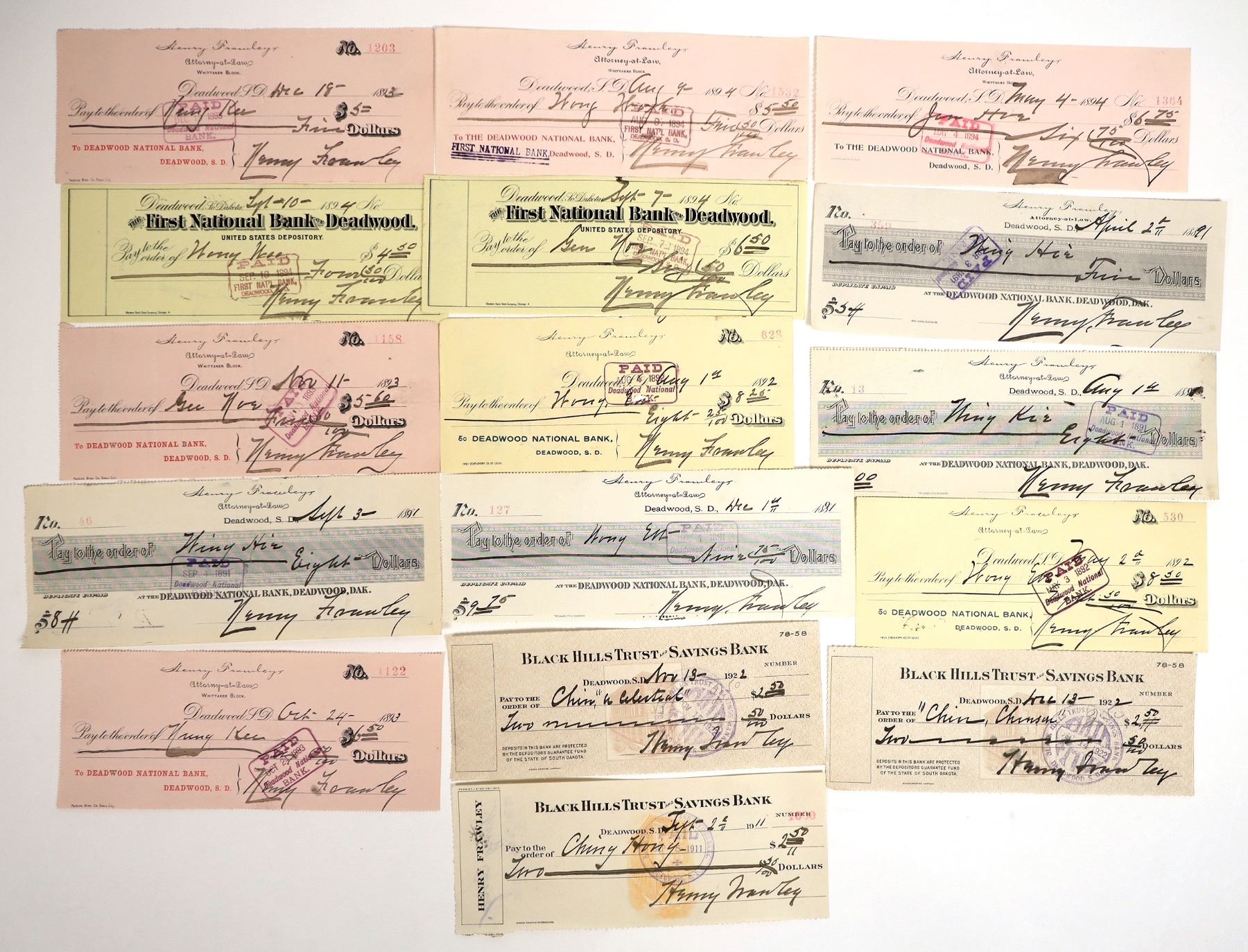 Lot of 16. This is a fantastic and important group that we sorted out of the much larger Frawley Deadwood check archive. All but 3 are 1890s. The Chinese played a crucial and complicated role in the development of the West, especially related to railroads and lumber. This group includes names like Gen Noe, Wan Woo, Hing Hie, Kee, and others, though many of the names could be incorrect Western spellings. Many of them are signed on the back with Chinese characters. A group worthy of much more research!