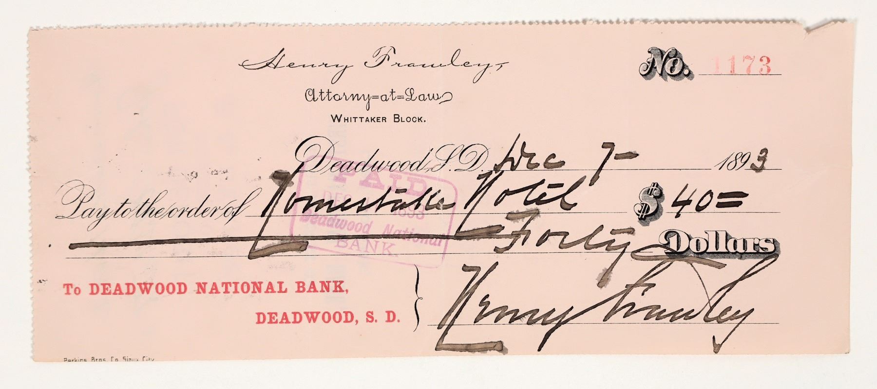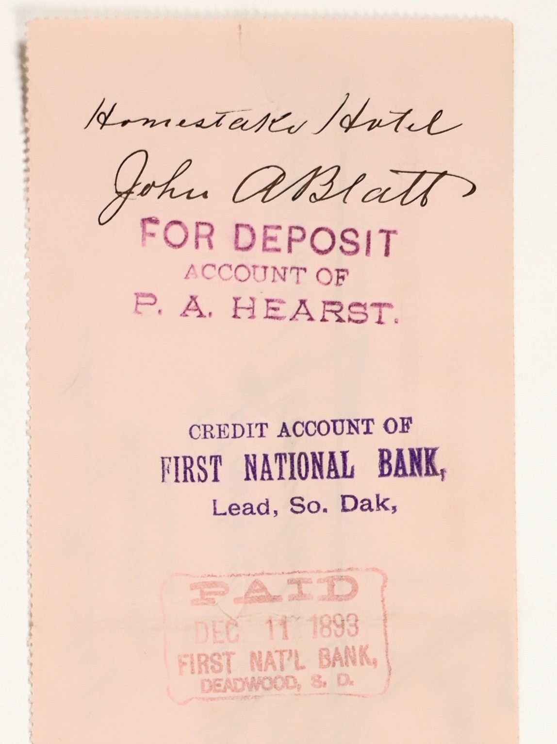 Deadwood check on the account of lawyer Henry Frawley, issued to the Homestake Hotel in 1893. Reverse is signed by John A. Platt and stamped "For Deposit Account of P.A. Hearst." This refers to Phoebe Apperson Hearst, wife to major mining figure George Hearst, and mother to newspaper magnate William Randolph Hearst. The Homestake Hotel was a branch of the Hearst Mercantile Company in Lead, South Dakota. Blatt was a Black Hills pioneer who arrived in 1876 and ran the hotel. George Hearst died just two years prior to this check being issued.