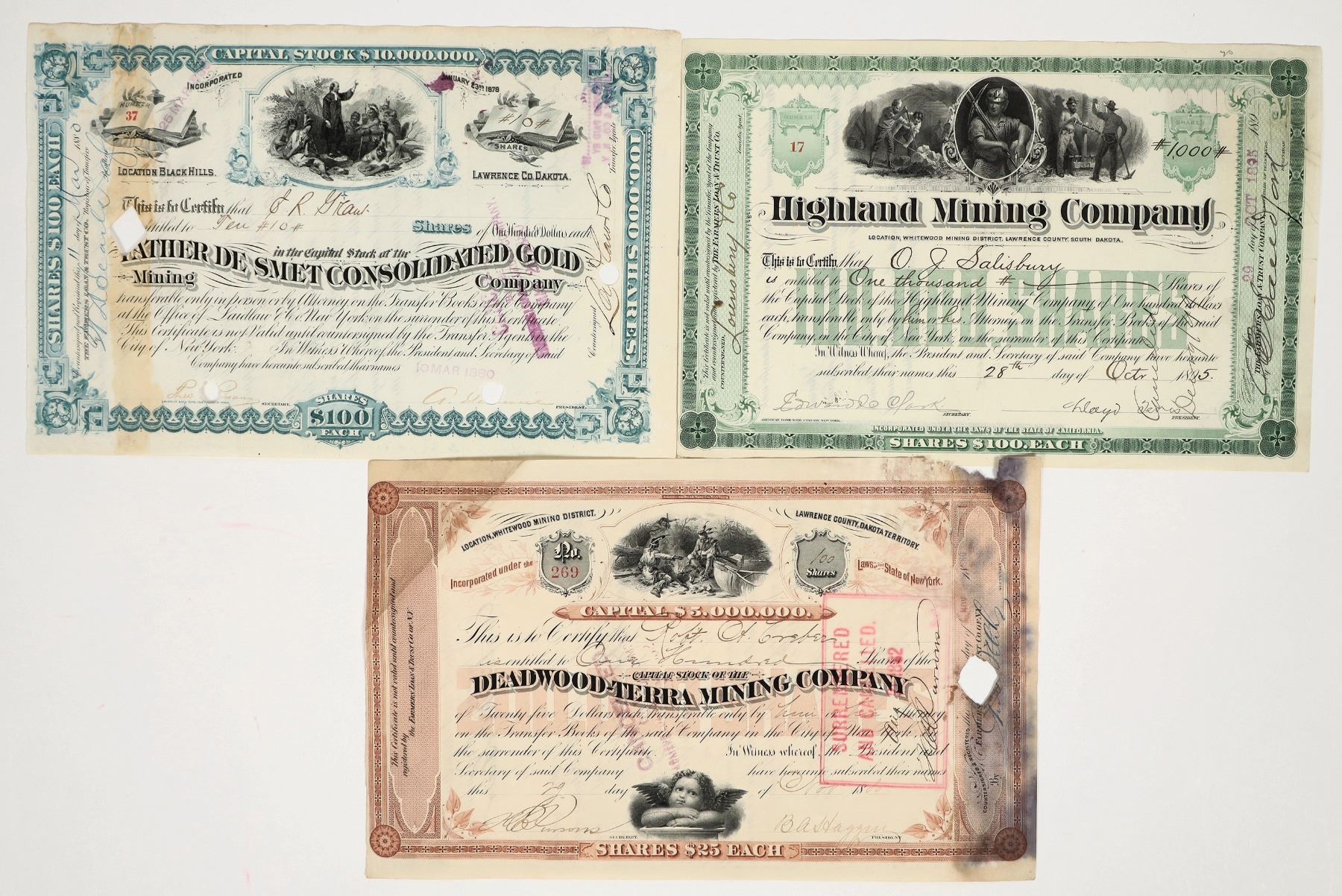 Lot of 3 different. Includes: Deadwood Terra 1880, signed by BA Haggin. Damaged at right, but extra rare; Highland Mining Comp 1895, signed by Llyod Tevis; and Father De Smet Consol in blue not the usual orange, rare, 1880.